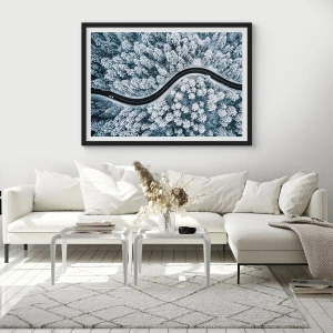 Affiche dans un cadre noir - Poster - Vue aérienne d'une route sinueuse dans une forêt hivernale - 70x50cm - À travers une forêt d'hiver - Décoration murale moderne pour le salon et la chambre ARTTOR