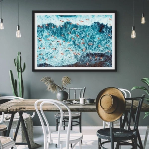 Affiche dans un cadre noir - Poster - Vue aérienne de flamants roses sur un océan bleu - 70x50cm - Défilé du bord de mer - Décoration murale moderne pour le salon et la chambre ARTTOR