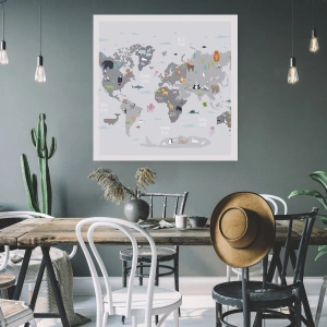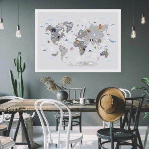 • Carte du monde, animaux, continents, Pour les enfants, Cartes du monde, Pastel, Animaux, Pour la chambre des enfants Gris, Verticale