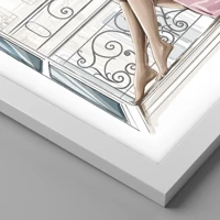 L'illustration capture parfaitement un moment de réflexion et un moment rien que pour soi. Des lignes douces et des couleurs pastel soulignent la délicatesse féminine, tandis que les détails architecturaux en arrière-plan confèrent à la composition un caractère élégant et parisien. Le style artistique de l'œuvre rend l'affiche intemporelle et s'intègre parfaitement aux intérieurs modernes.