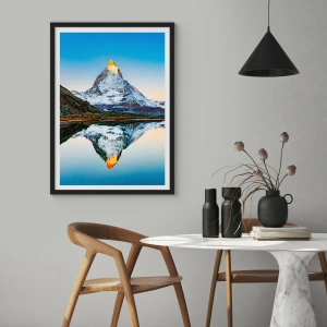 - L'affiche représente un majestueux sommet enneigé se reflétant dans un lac paisible. Le ciel bleu clair et la douce lumière créent une atmosphère d'harmonie et de paix.