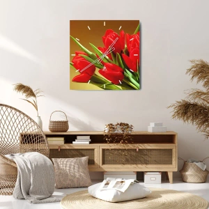 Horloge murale - Pendule murale - Un bouquet de tulipes rouges sur fond doré avec des feuilles vertes. - 30x30cm - Amas de joie printanière - Décoration murale moderne pour le salon et la chambre ARTTOR