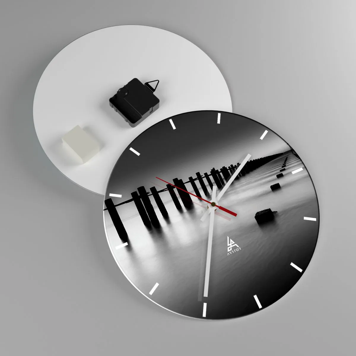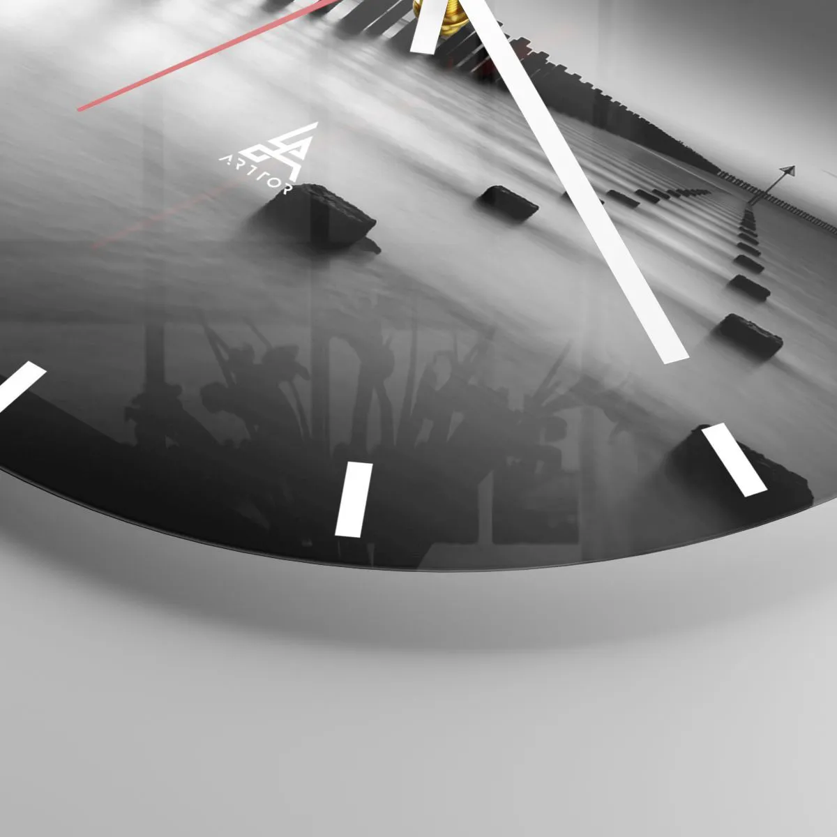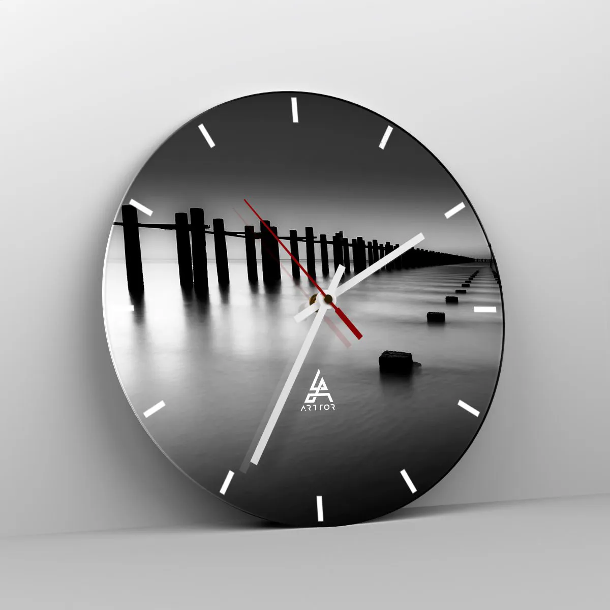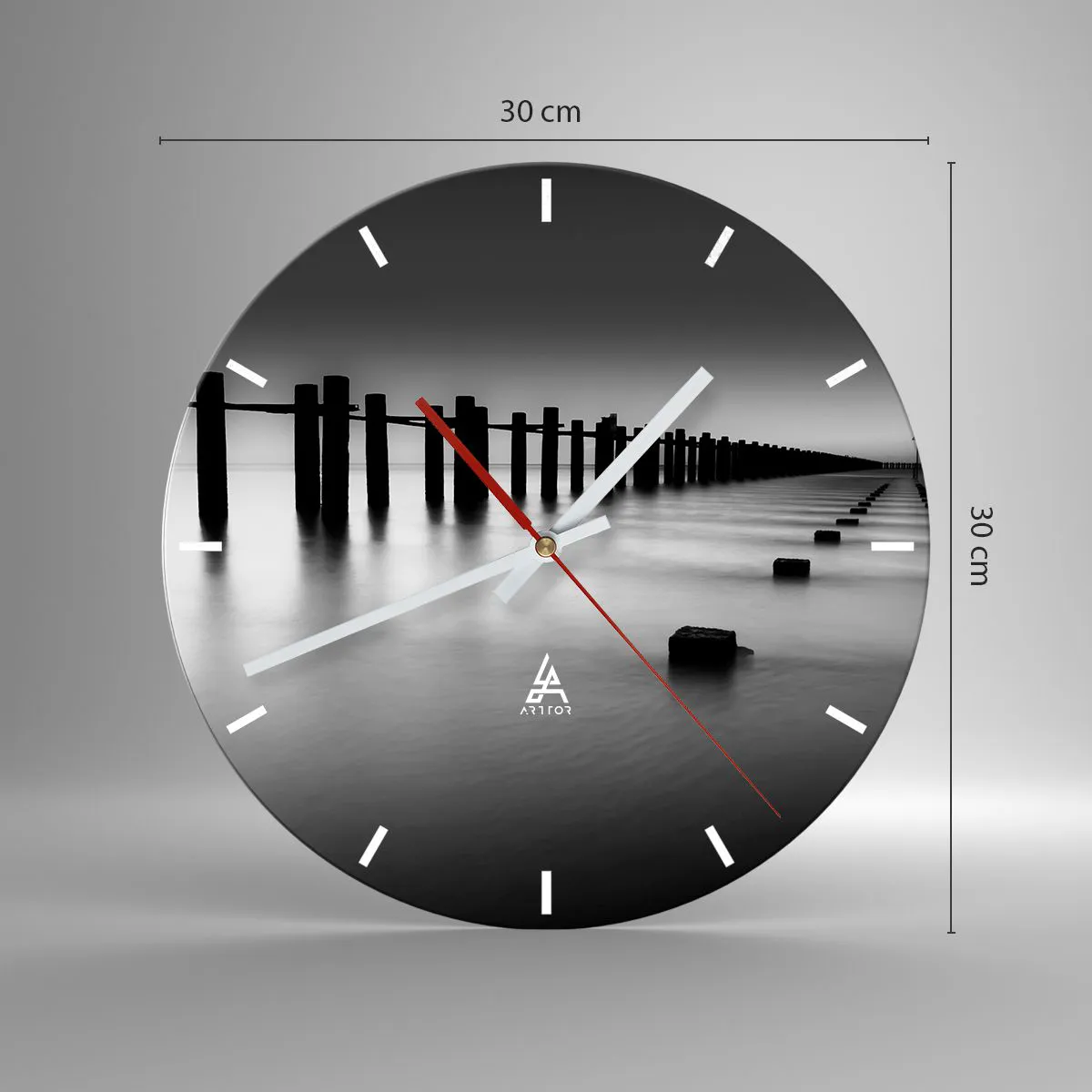 Distance grise dans le brouillard est une horloge murale élégante qui séduit par sa simplicité et sa subtilité. Le motif principal est une jetée noire et blanche s'éloignant sur une eau calme, créant une atmosphère de tranquillité et d'harmonie. Ce paysage intemporel s'intégrera parfaitement aux intérieurs modernes et minimalistes.