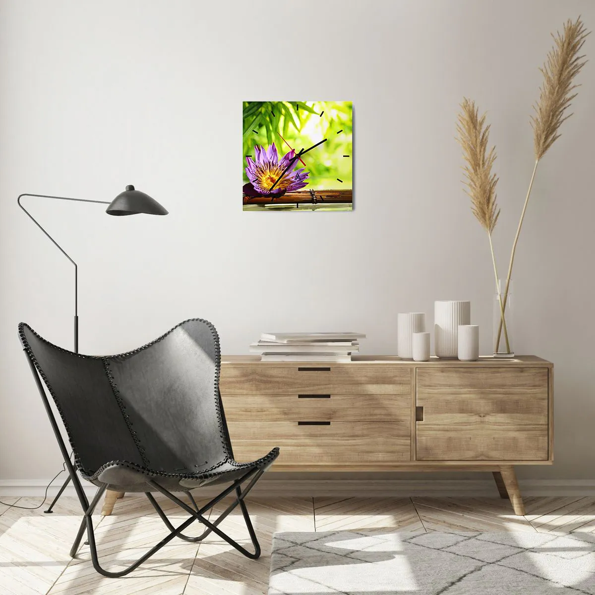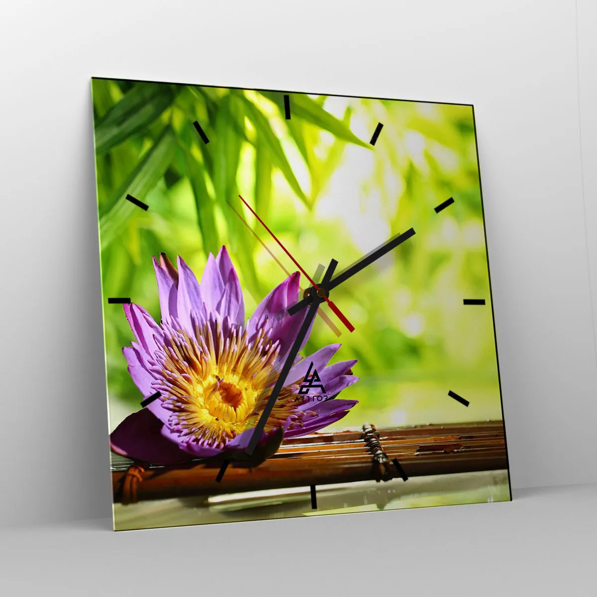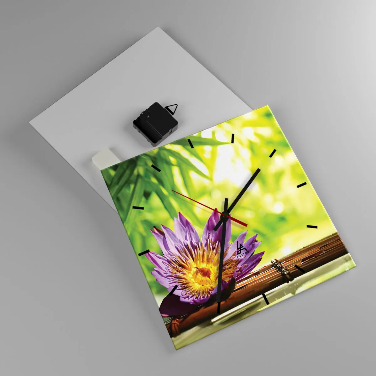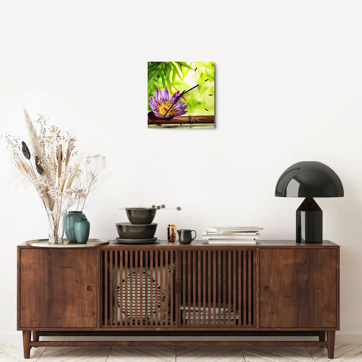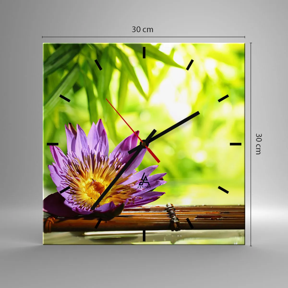 Horloge murale - Pendule murale - Fleur de lotus violette sur fond de feuilles de bambou vertes - 30x30cm - Sous le soleil asiatique - Décoration murale moderne pour le salon et la chambre ARTTOR