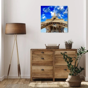 L'horloge murale « Vers le ciel et les nuages » est un hommage unique à l'un des symboles les plus reconnaissables de l'architecture française et mondiale. Le cadran représente la Tour Eiffel vue d'en bas, vous permettant d'apprécier la majesté et le savoir-faire de cette merveille de fer. Le fond bleu du ciel et les nuages délicats confèrent à l'ensemble une sensation de légèreté et d'espace, soulignant son caractère unique.