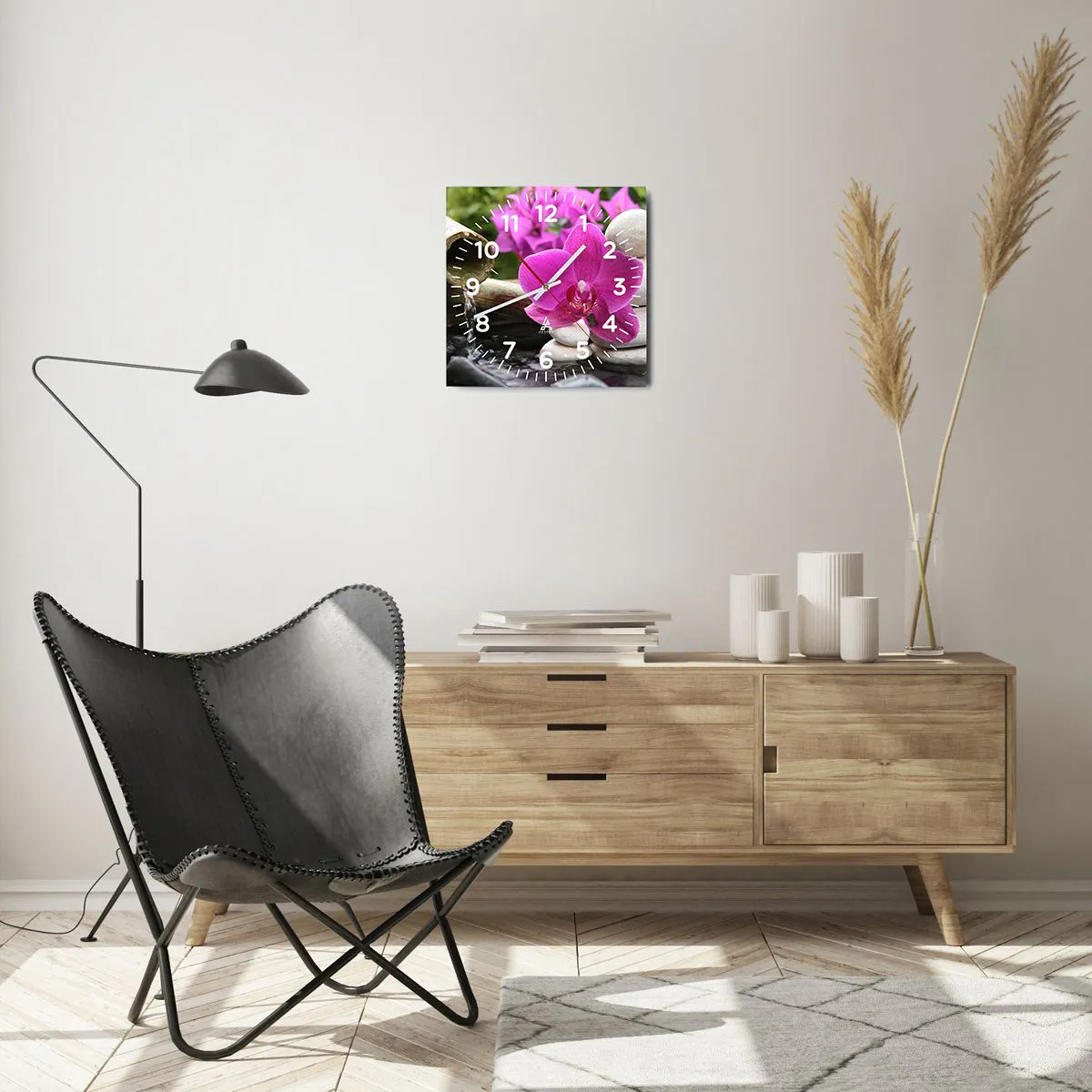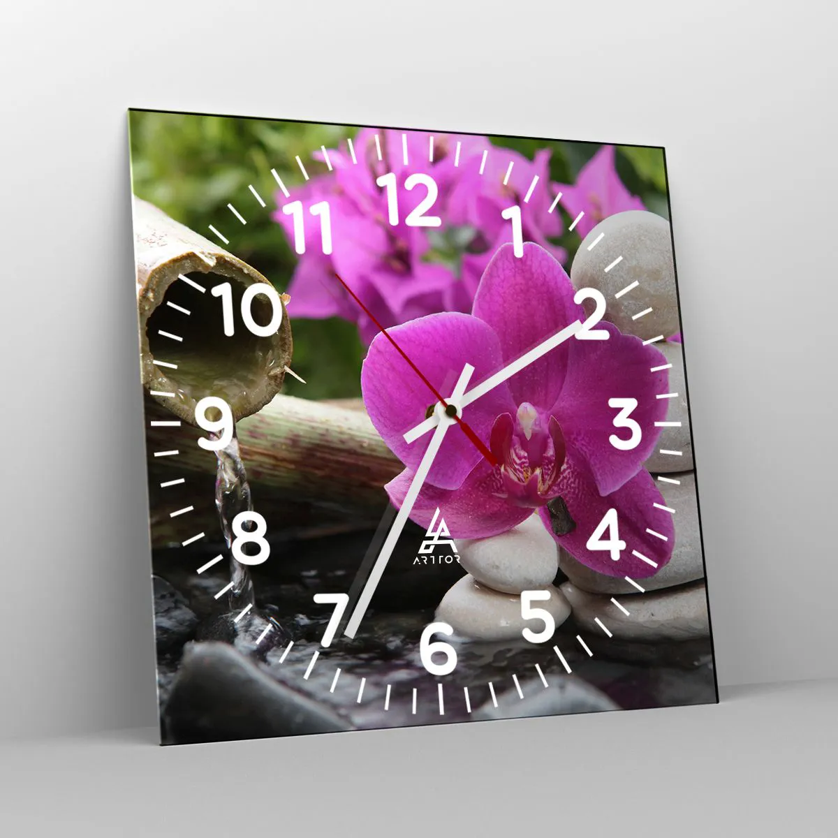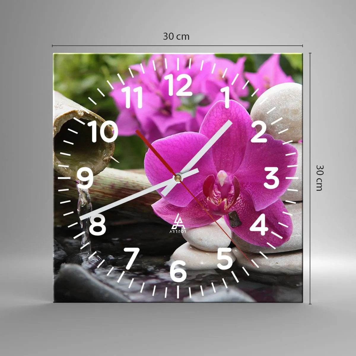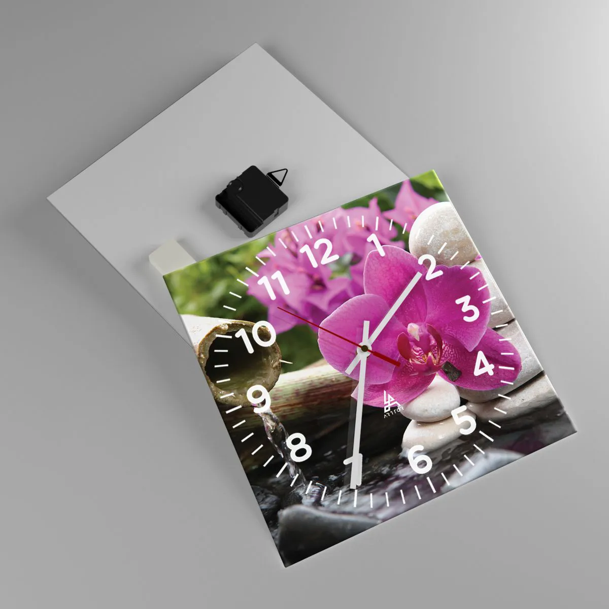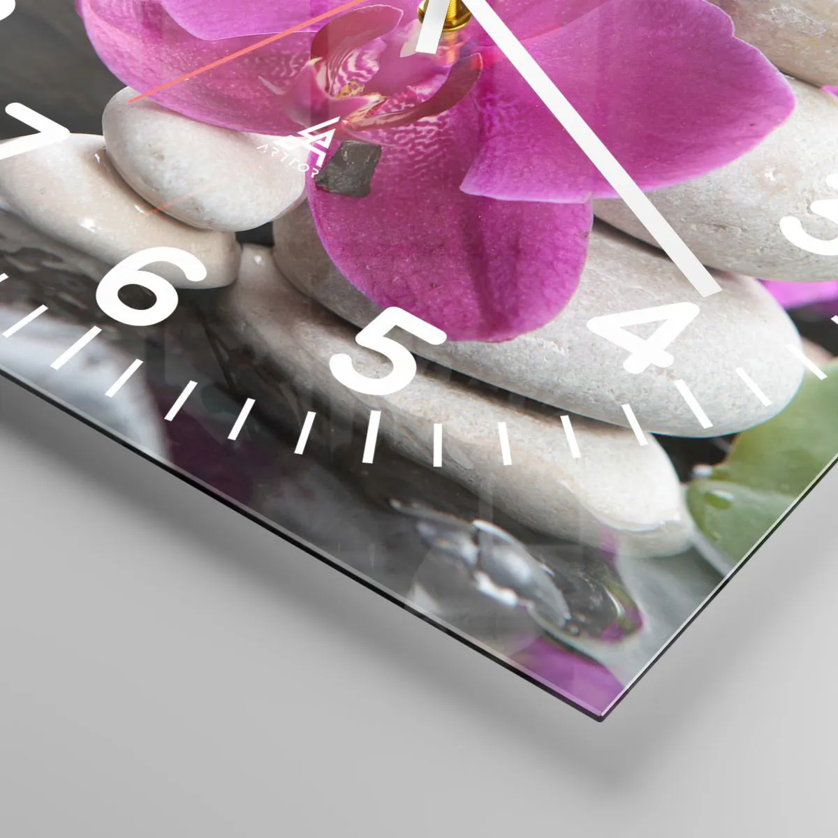 L'horloge est fabriquée à l'aide de technologies d'impression modernes, qui garantissent la préservation des couleurs naturelles et une saturation élevée des couleurs. La production d'horloges sur verre se déroule en plusieurs étapes. Une impression de haute qualité et deux couches de protection thermique liées au verre. Pour cela, nous utilisons la technologie innovante des fours de laminage du verre dans un environnement sous vide.