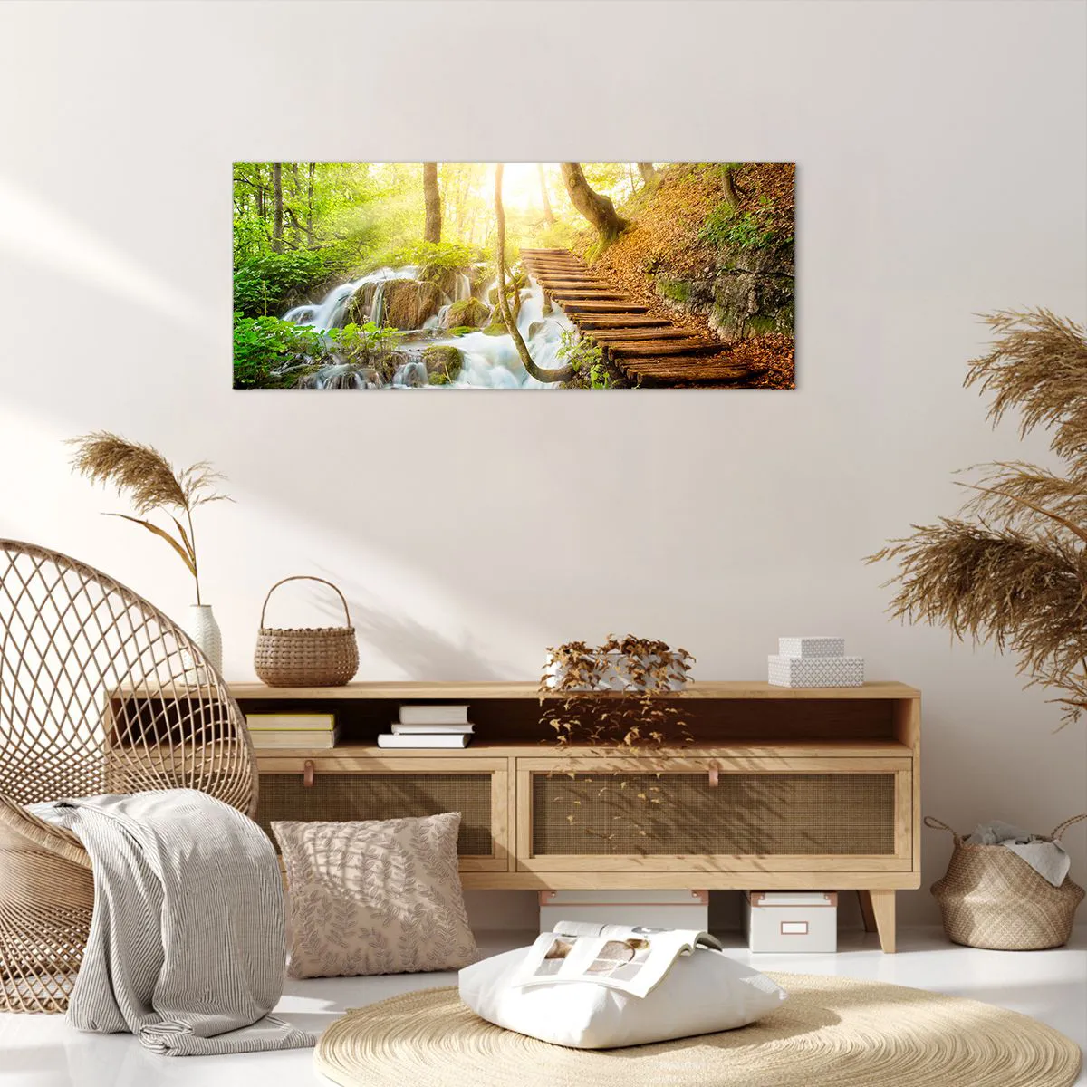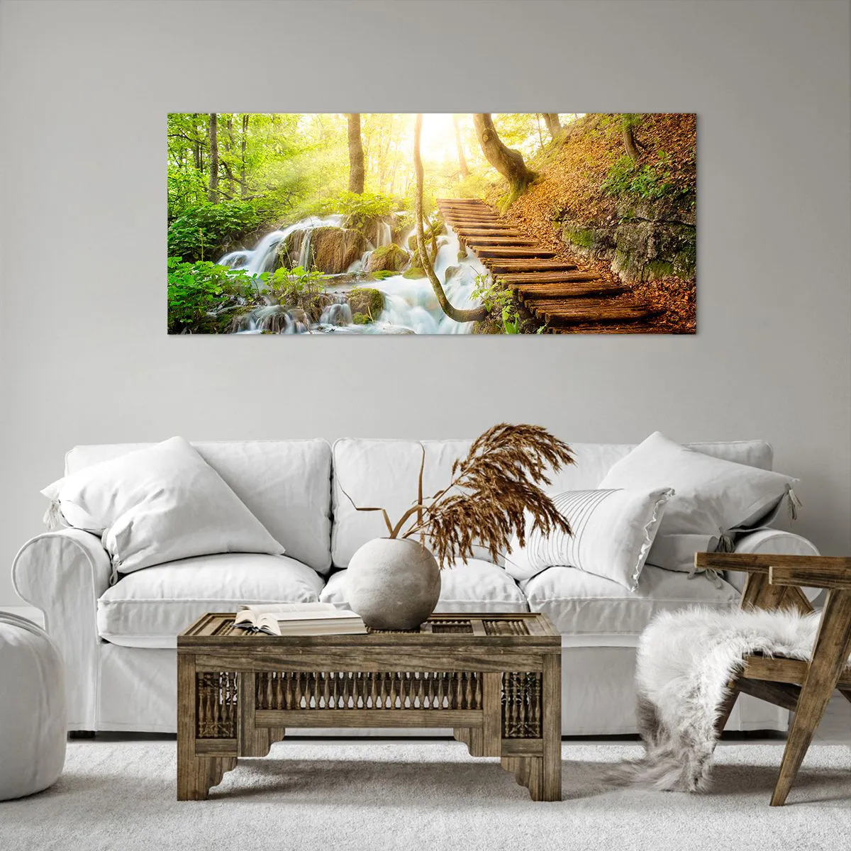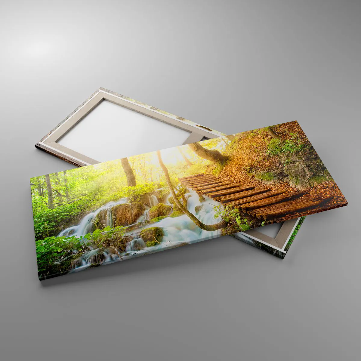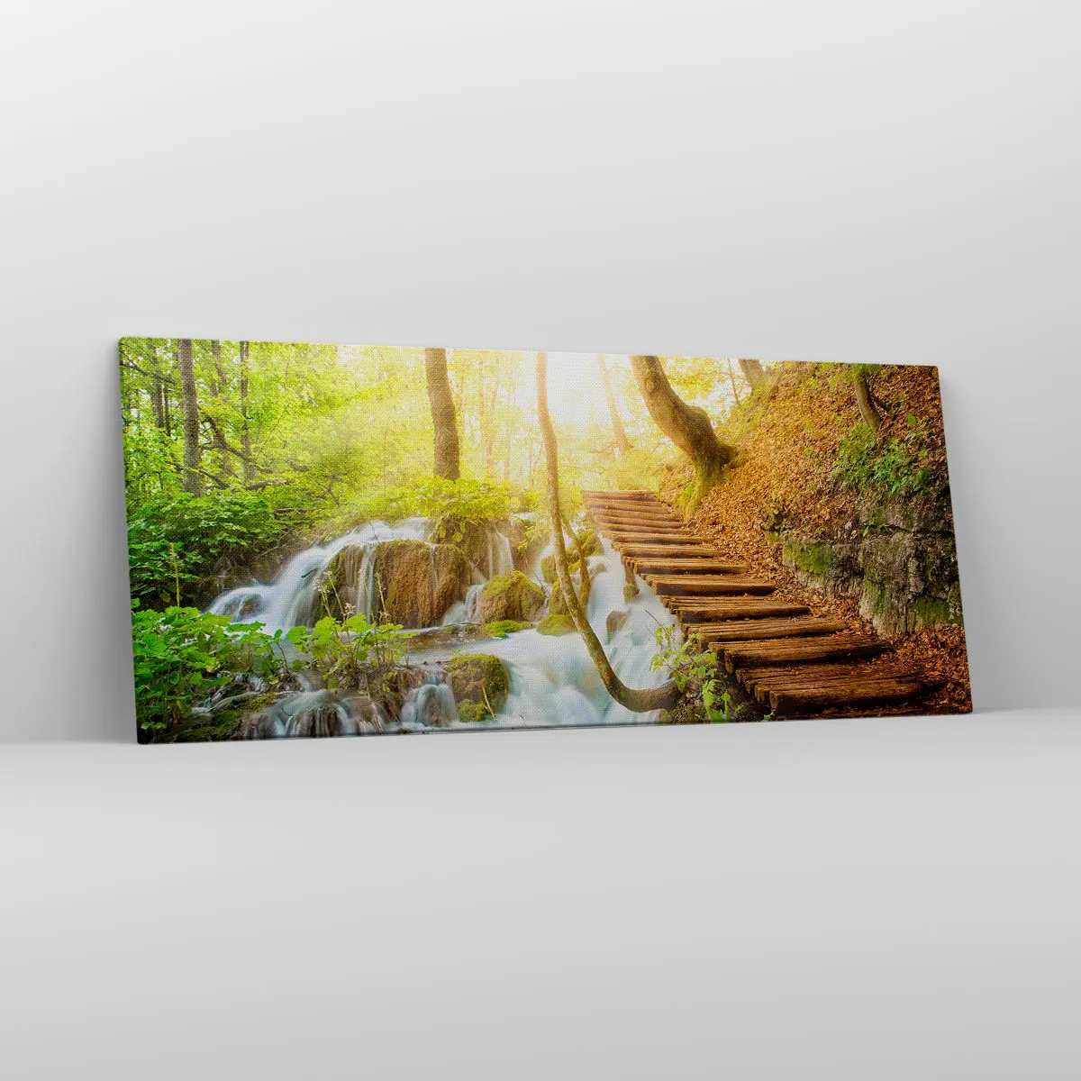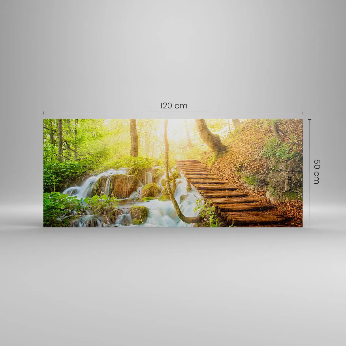 Impression sur toile - Image sur toile - Chemin forestier avec escaliers en bois près de la cascade - 120x50cm - Une fraîcheur tant désirée - Décoration murale moderne pour le salon et la chambre ARTTOR