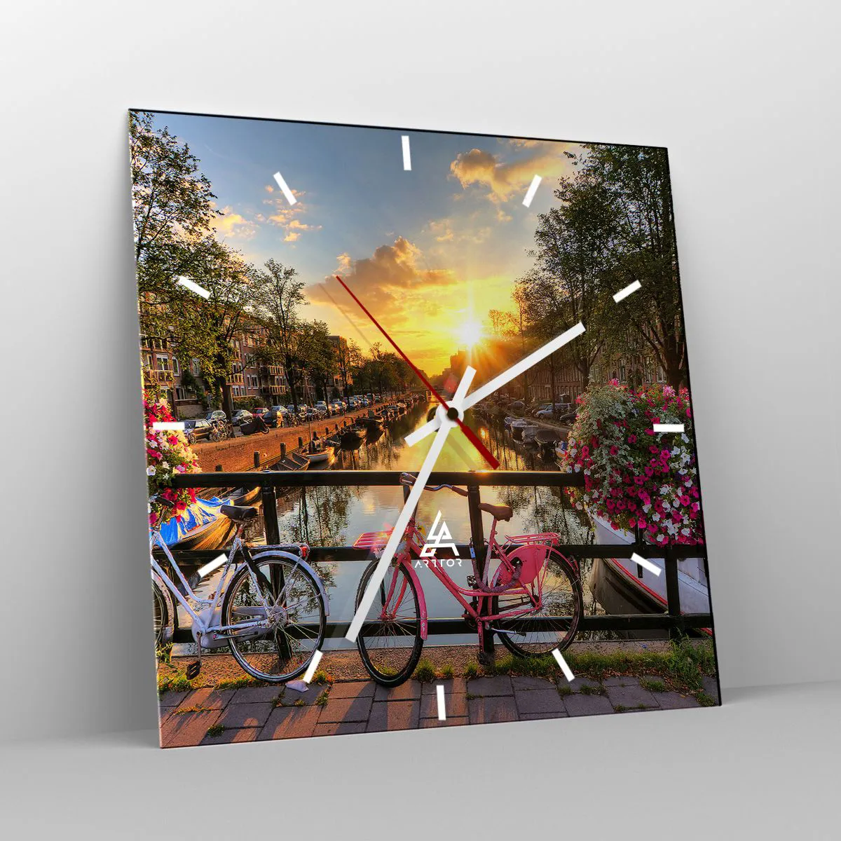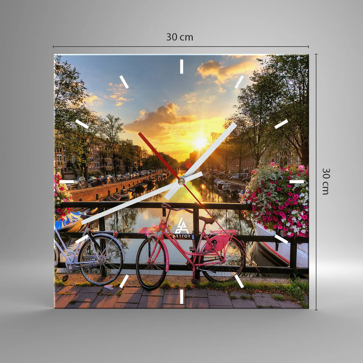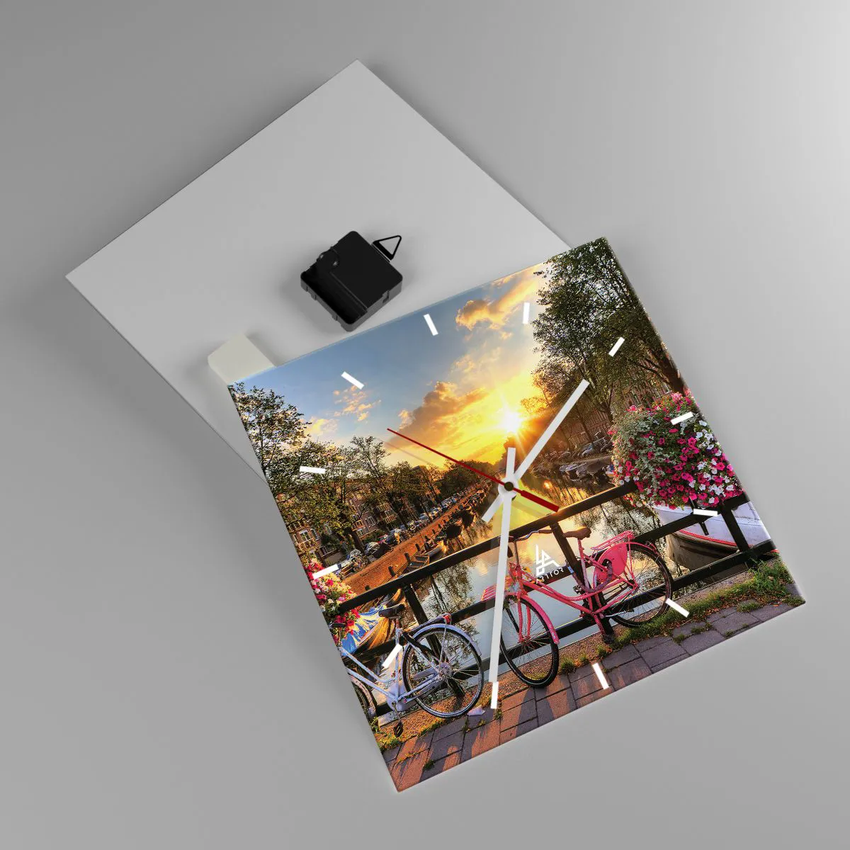 Horloge murale - Pendule murale - Des vélos sur un pont à la lueur du soleil couchant - 30x30cm - Matin de printemps à Amsterdam - Décoration murale moderne pour le salon et la chambre ARTTOR