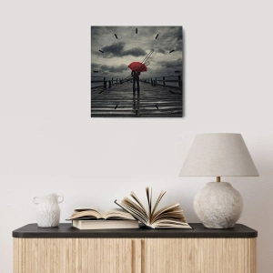 - Une horloge murale avec un motif d'une personne avec un parapluie rouge sur une jetée un jour de pluie, parfaite pour les intérieurs de style artistique et moderne.