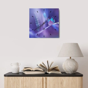 - L'horloge murale « Bijou de la nature » présente l'image d'un papillon sur un fond aux nuances subtiles de violet et de bleu. Parfaite pour les intérieurs empreints d'élégance et de sérénité.
