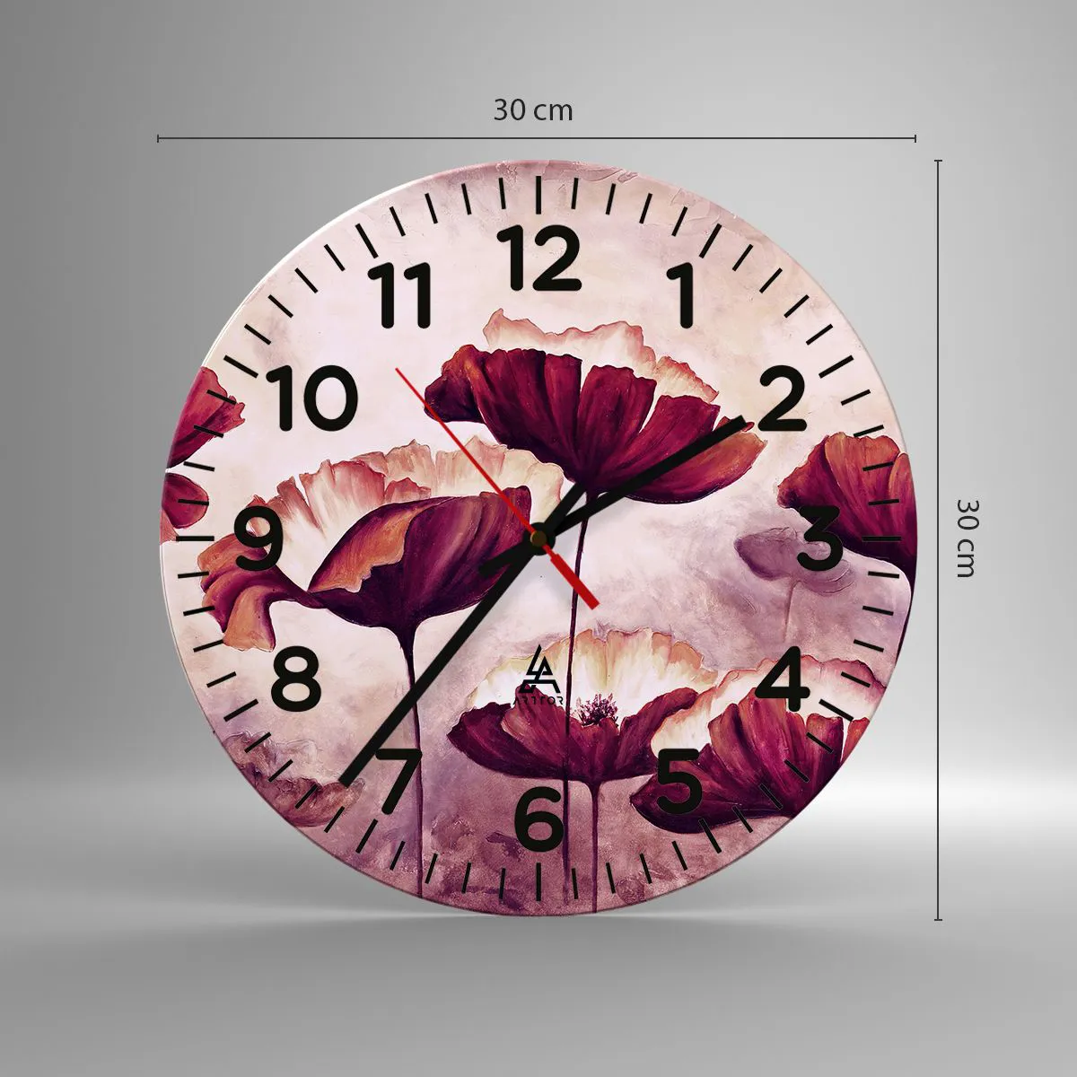 L'horloge est produite avec un verre de sécurité de 4 mm d'épaisseur. La technologie de fabrication de l'horloge est conforme à la classe de sécurité 2B2 selon la norme PN-EN 12600 : 2004, qui garantit la résistance aux chocs. L'horloge en verre est prête à être accrochée - elle a une attache en métal attaché à l'arrière et une entretoise en mousse régulant la distance uniformément de l'horloge par rapport au mur. L'horloge a un mécanisme flottant silencieux alimenté par une pile 1.5V - pile AA (pile non incluse).