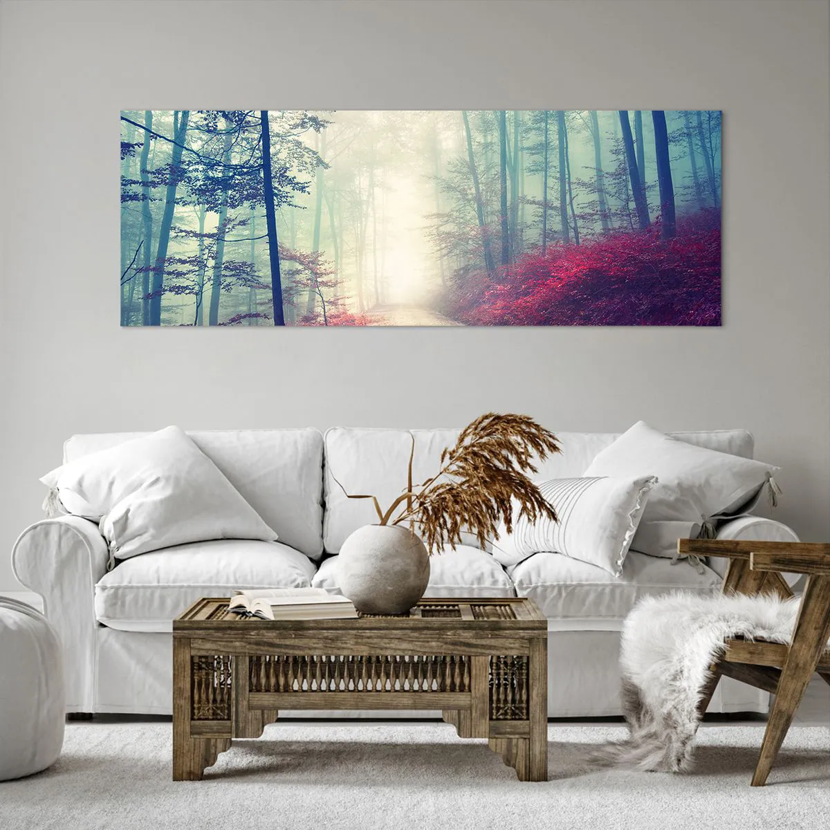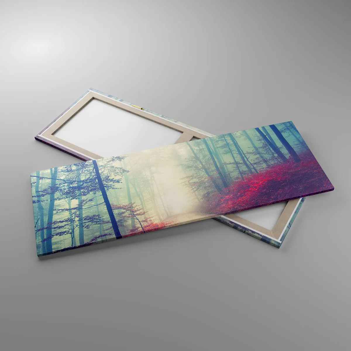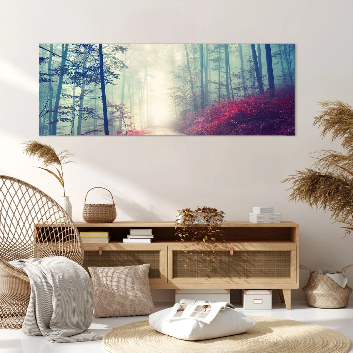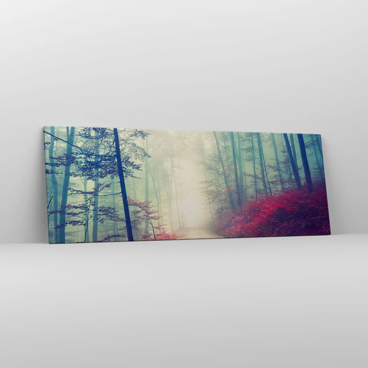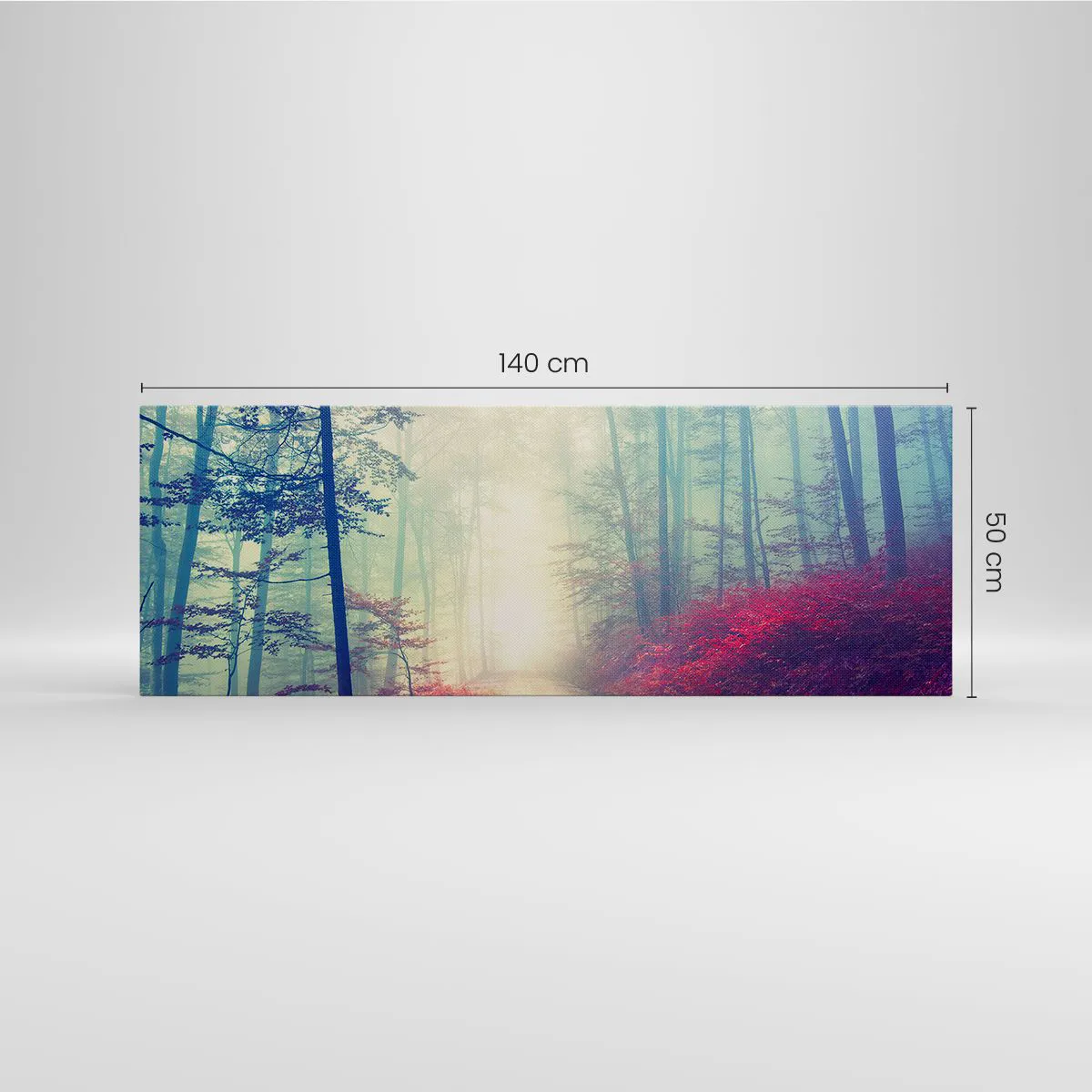 Impression sur toile - Image sur toile - Un sentier forestier magique entouré d'arbres et de brouillard - 140x50cm - Comme c'est bon de se lever à l'aube - Décoration murale moderne pour le salon et la chambre ARTTOR