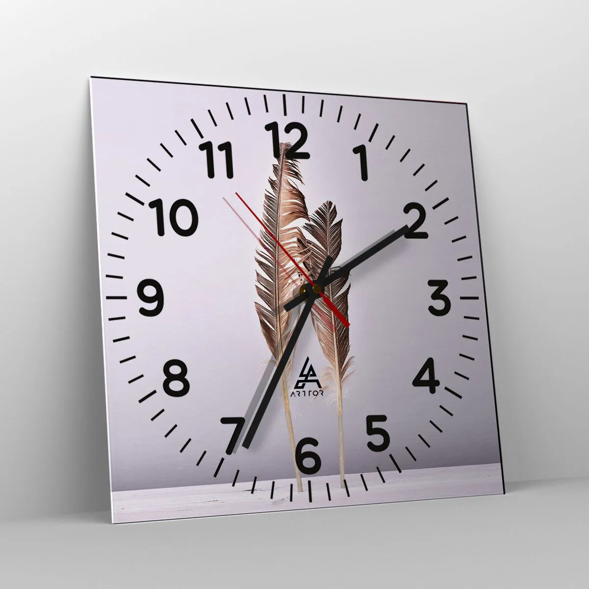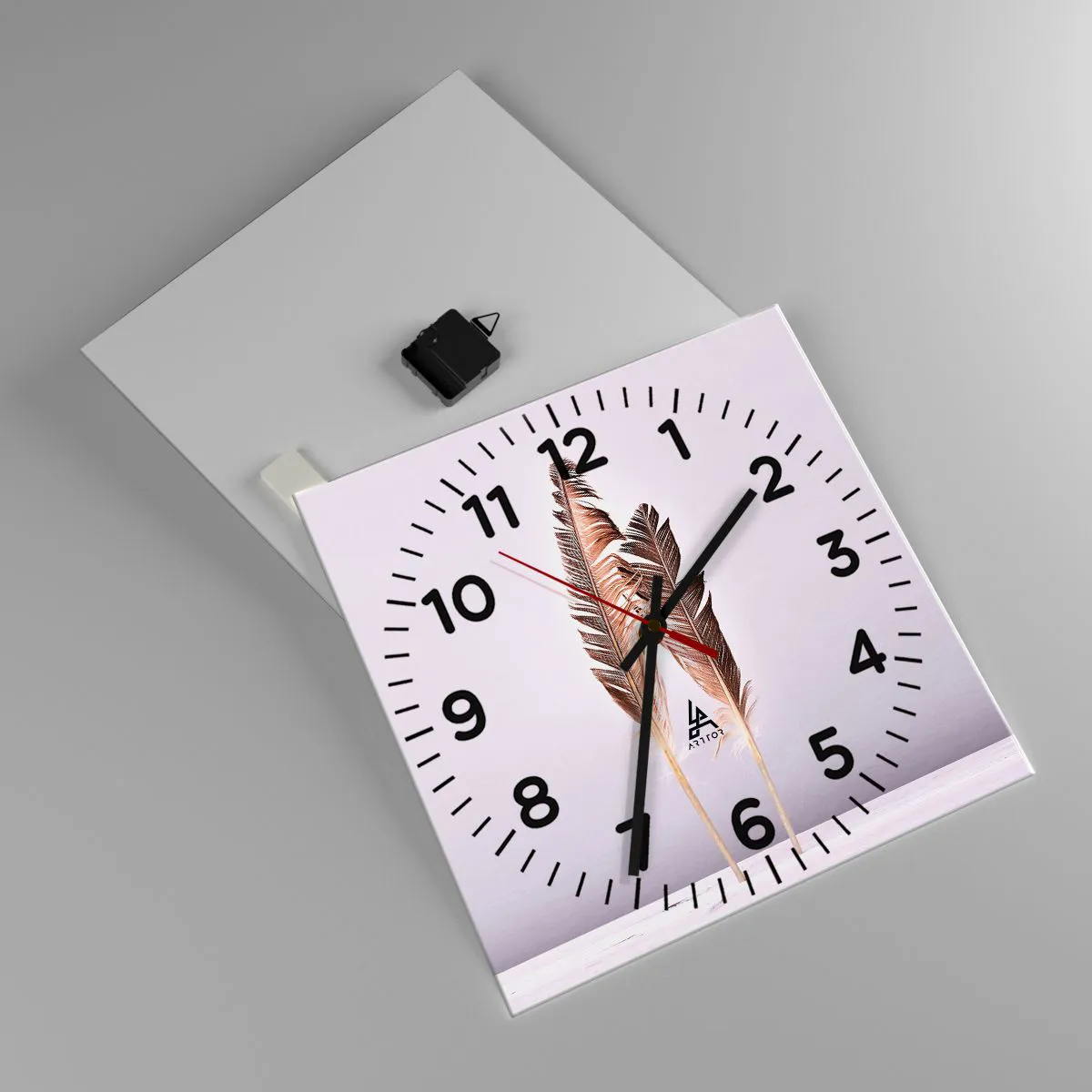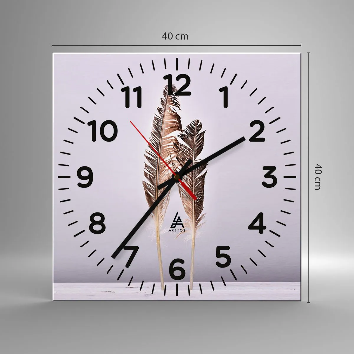 L'horloge est produite avec un verre de sécurité de 4 mm d'épaisseur. La technologie de fabrication de l'horloge est conforme à la classe de sécurité 2B2 selon la norme PN-EN 12600 : 2004, qui garantit la résistance aux chocs. L'horloge en verre est prête à être accrochée - elle a une attache en métal attaché à l'arrière et une entretoise en mousse régulant la distance uniformément de l'horloge par rapport au mur. L'horloge a un mécanisme flottant silencieux alimenté par une pile 1.5V - pile AA (pile non incluse).