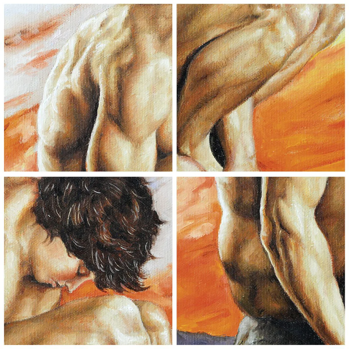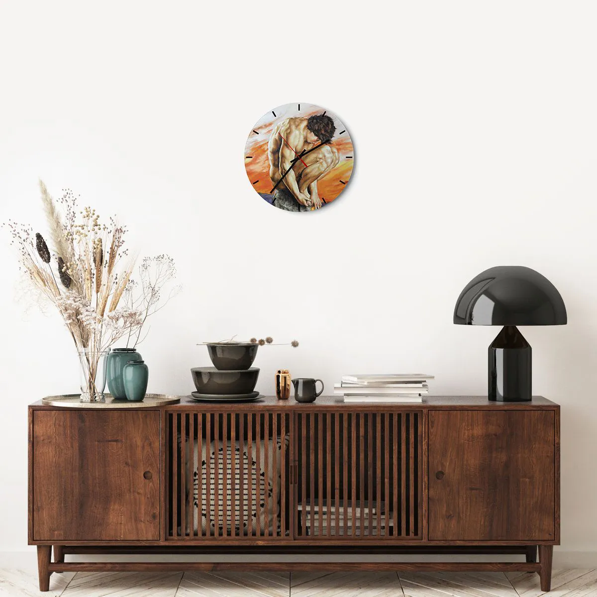 L'horloge murale « Immersed in Himself » est un élément décoratif unique alliant art et praticité. Le cadran représente une figure masculine pensive sur fond de coucher de soleil pittoresque. Les nuances chaudes d'orange et d'or qui dominent le fond confèrent à l'ensemble une profondeur et un caractère émotionnel uniques.