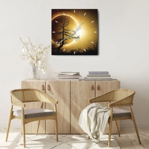 « Éclipse solaire » est une horloge murale unique qui représente une vue spectaculaire et fascinante d'une éclipse solaire avec une silhouette d'arbre et un ciel doré illuminé en arrière-plan. Ce motif apporte une atmosphère extraordinaire aux intérieurs, alliant beauté de la nature et mystère cosmique.