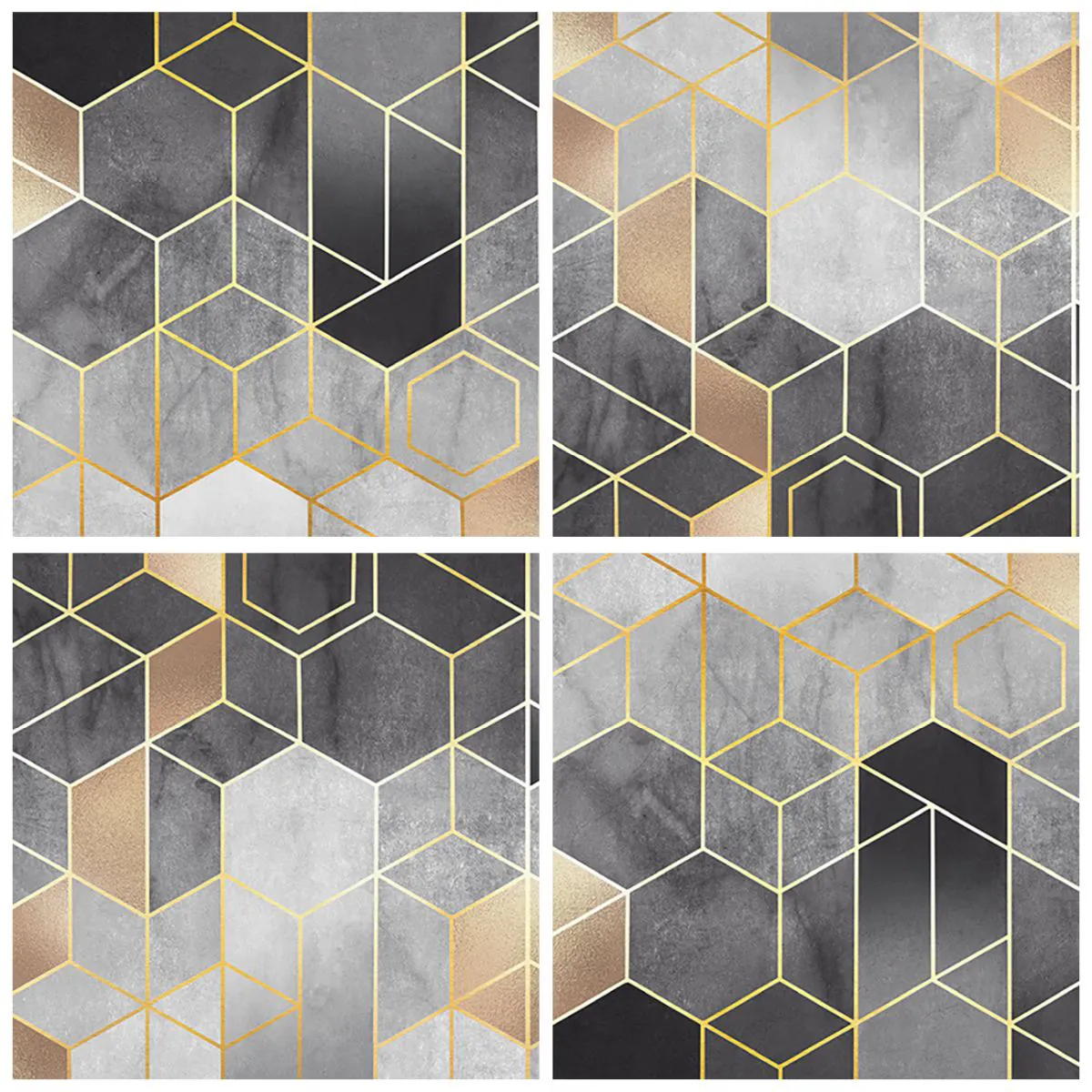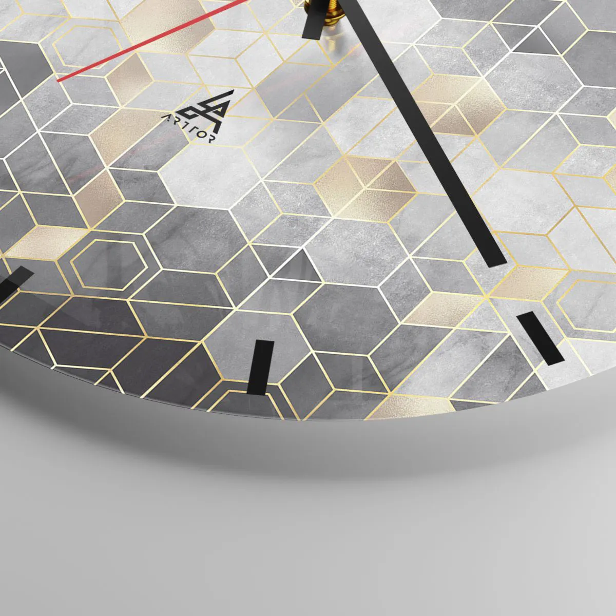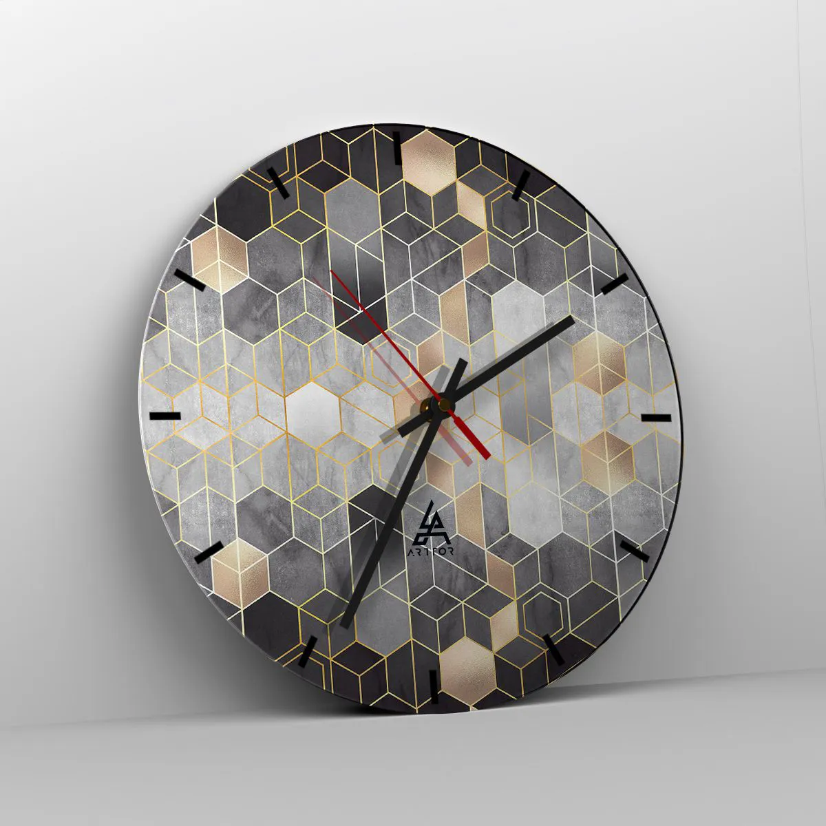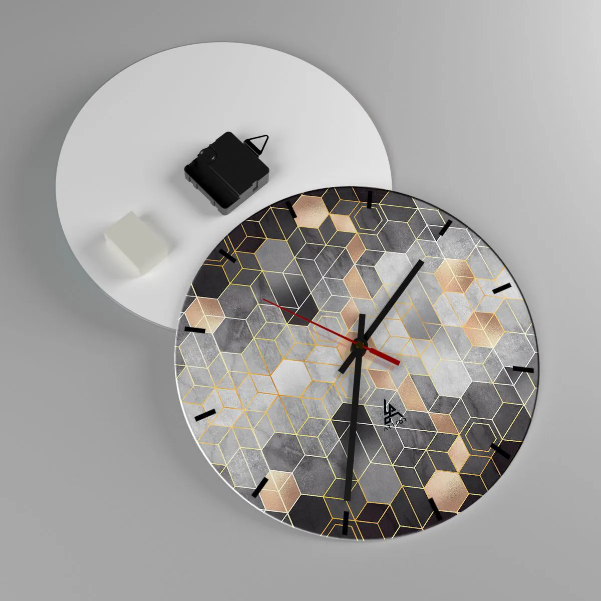 L'horloge murale « Composition Diamant » est une pièce décorative moderne et élégante qui séduit par la précision de son motif et la brillance subtile de l'or. La mosaïque géométrique dans les tons de gris, de noir et d'or crée un effet de profondeur, conférant une touche luxueuse à votre intérieur.