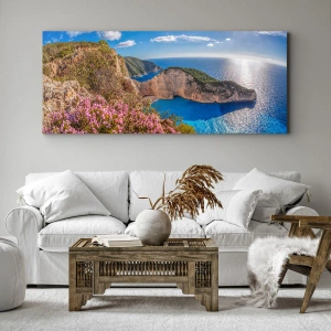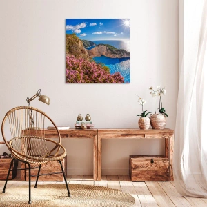 - Un paysage grec avec une falaise pittoresque, une mer turquoise et un soleil éclatant, encadré de fleurs délicates. Ce tableau respire l'harmonie et la beauté de la nature, s'intégrant parfaitement aux intérieurs d'inspiration méditerranéenne.