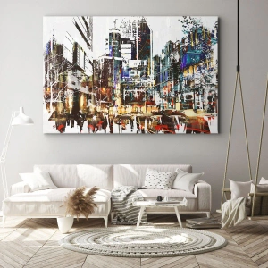 - Ce tableau représente un paysage urbain moderne dans un style artistique aux détails dynamiques. Parfait pour les intérieurs contemporains.