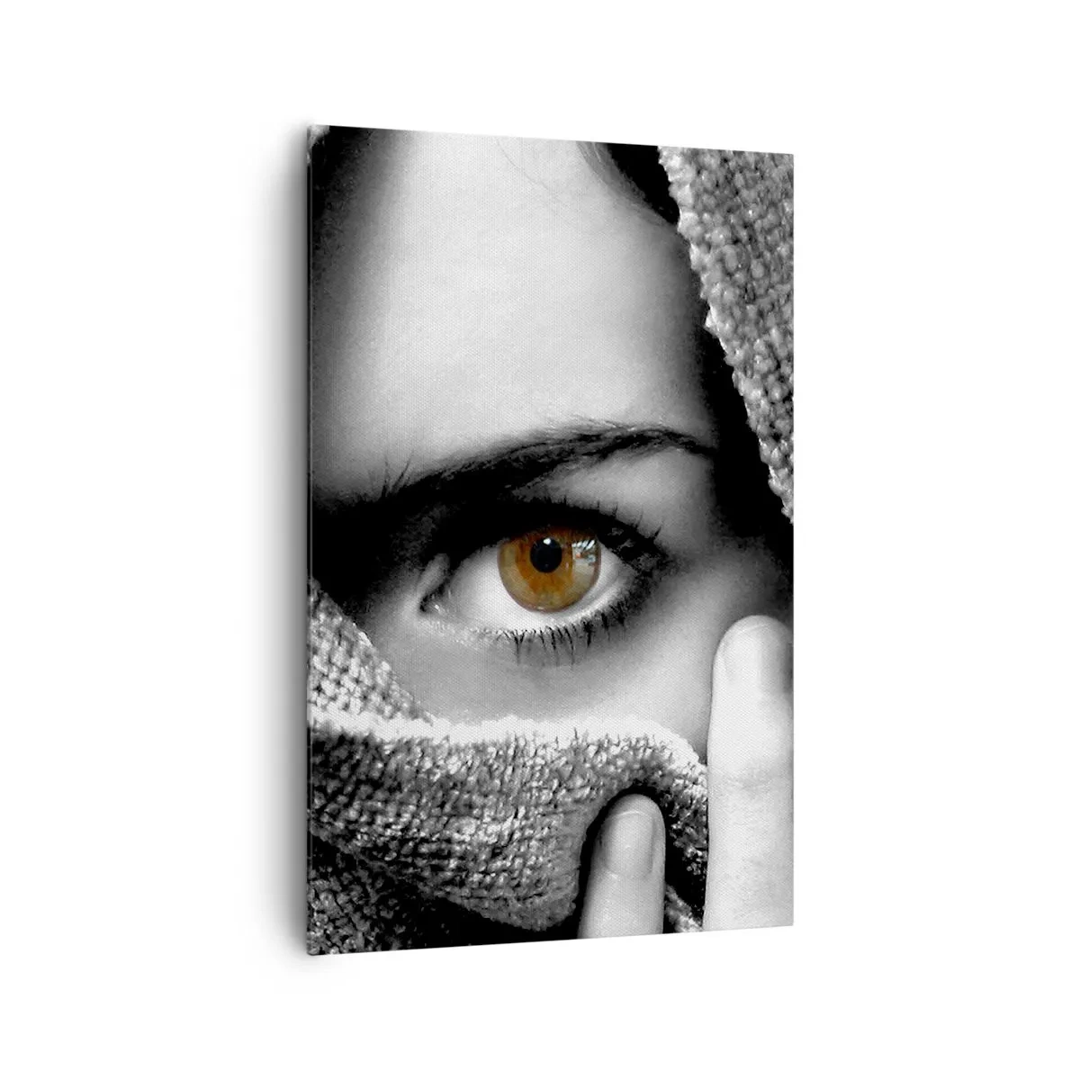 Impression sur toile - Image sur toile - Portrait d'une femme à l'oeil ambré recouvert d'un tissu aux tons gris. - 80x120cm - Apprenez le secret - Décoration murale moderne pour le salon et la chambre ARTTOR
