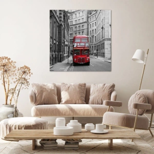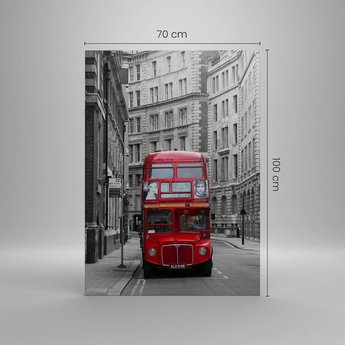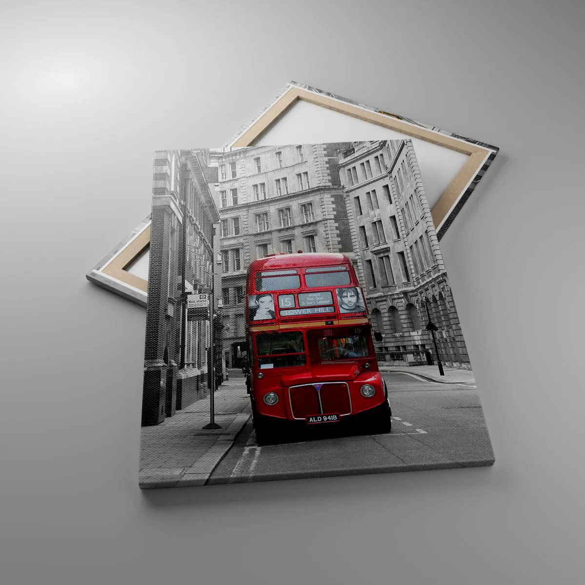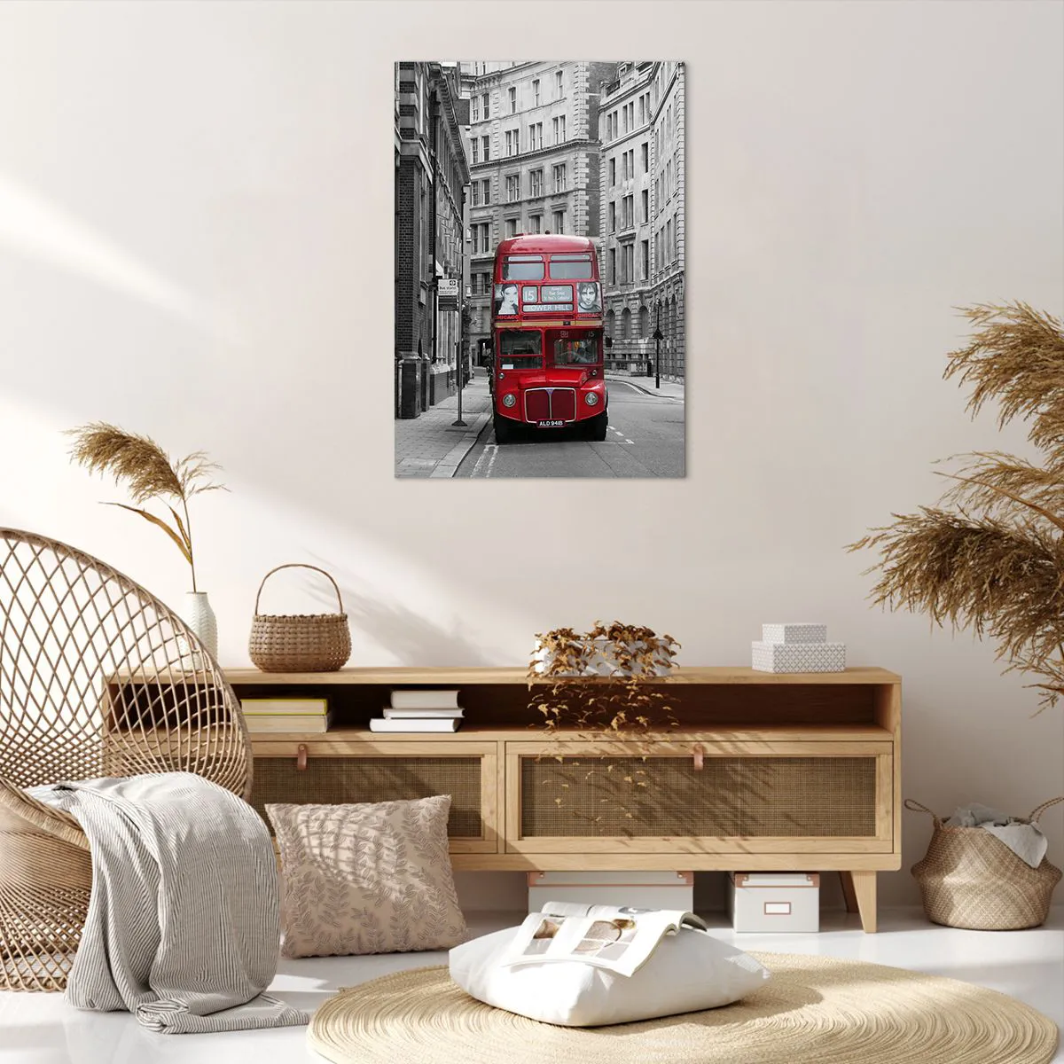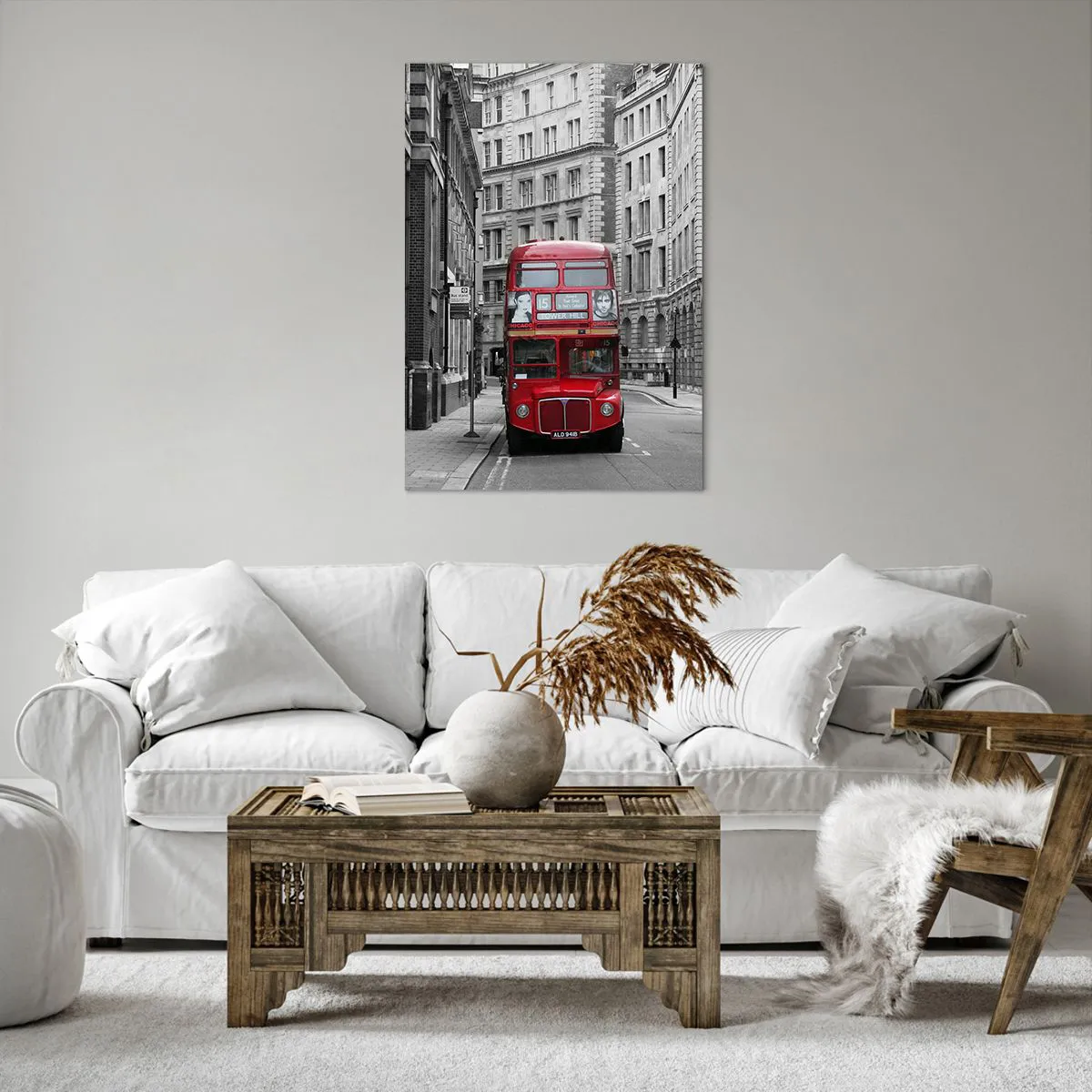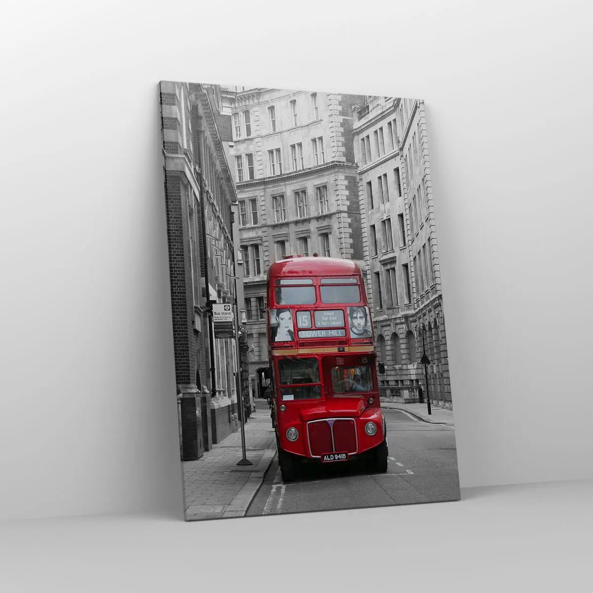Impression sur toile - Image sur toile - Un bus rouge sur fond de bâtiments urbains noirs et blancs. - 70x100cm - La vie de tous les jours ne doit pas être grise - Décoration murale moderne pour le salon et la chambre ARTTOR