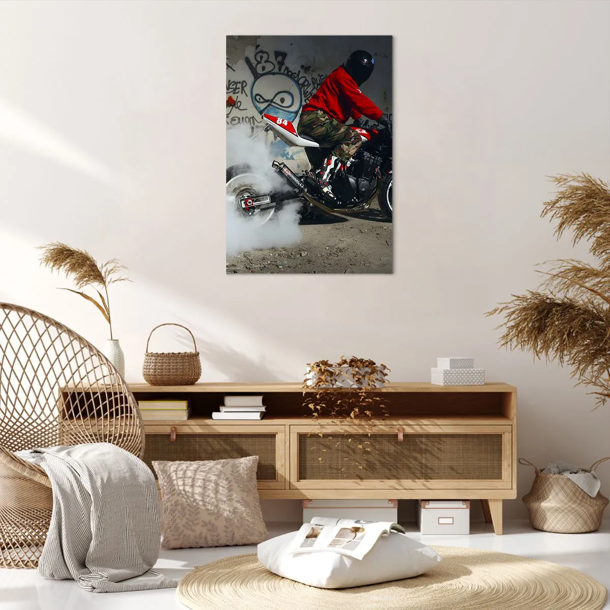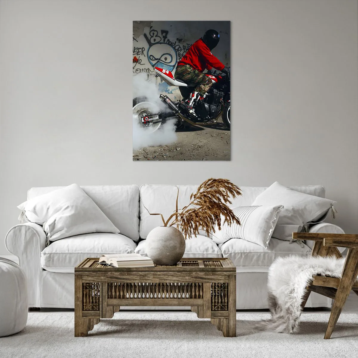Impression sur toile - Image sur toile - Un motard effectue un drift spectaculaire dans un bâtiment abandonné couvert de graffitis. - 70x100cm - Pourchassez moi! - Décoration murale moderne pour le salon et la chambre ARTTOR