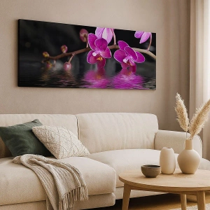 Impression sur toile - Image sur toile - Orchidées violettes sur une eau calme sur fond noir - 70x100cm - Reflet lilas de la beauté - Décoration murale moderne pour le salon et la chambre ARTTOR