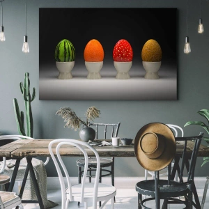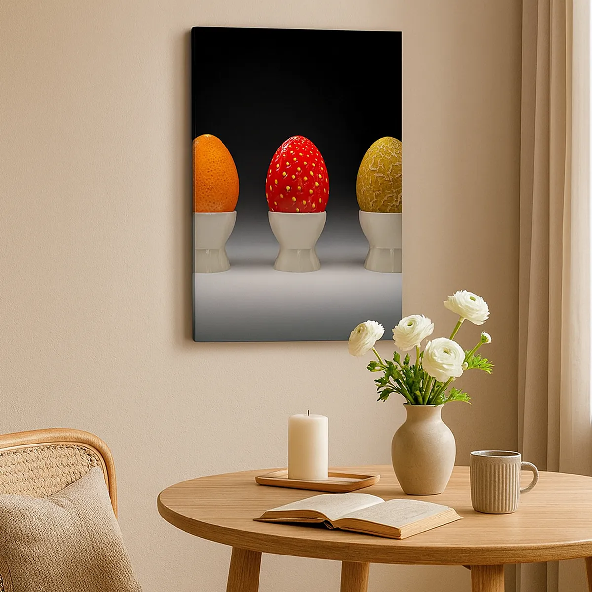 Impression sur toile - Image sur toile - Œufs colorés ressemblant à des fruits sur un fond sombre - 50x70cm - Petit-déjeuner fruité - Décoration murale moderne pour le salon et la chambre ARTTOR