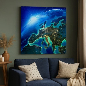 Impression sur toile - Image sur toile - Une vue d'Europe depuis l'espace à la lueur du soleil levant. - 50x70cm - Europe pétillante - Décoration murale moderne pour le salon et la chambre ARTTOR