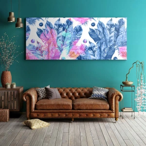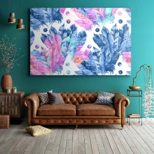 Impression sur toile - Image sur toile - Motif abstrait avec des plumes colorées dans des tons pastel - 50x70cm - Plumes en rose et bleu - Décoration murale moderne pour le salon et la chambre ARTTOR