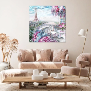 Impression sur toile - Image sur toile - Une vue romantique de Paris avec la Tour Eiffel et un balcon rempli de fleurs - 70x100cm - C'est le plus beau ici en mai - Décoration murale moderne pour le salon et la chambre ARTTOR