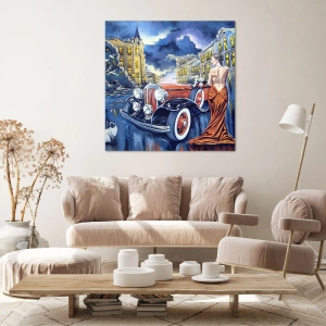 Impression sur toile - Image sur toile - Une femme dans une robe élégante à côté d'une voiture rétro la nuit - 50x70cm - Nocturne en bleu et corail - Décoration murale moderne pour le salon et la chambre ARTTOR