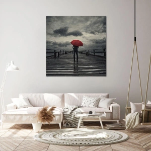 Impression sur toile - Image sur toile - Une personne avec un parapluie rouge sur une jetée pluvieuse - 70x100cm - Peu importe qu'il pleuve - Décoration murale moderne pour le salon et la chambre ARTTOR