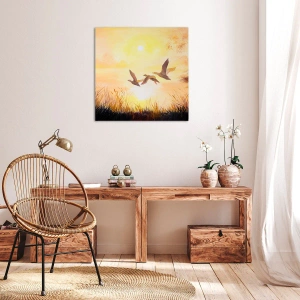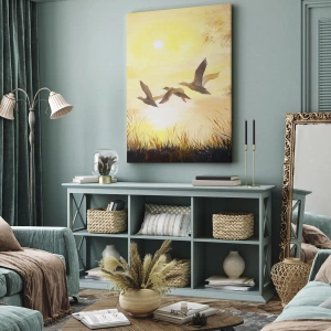 Impression sur toile - Image sur toile - Canards volant au lever du soleil au-dessus du lac - 80x120cm - Le début d'un long voyage - Décoration murale moderne pour le salon et la chambre ARTTOR