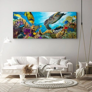 Impression sur toile - Image sur toile - Monde sous-marin avec des poissons colorés et une tortue dans le corail - 50x70cm - Promenade de corail - Décoration murale moderne pour le salon et la chambre ARTTOR
