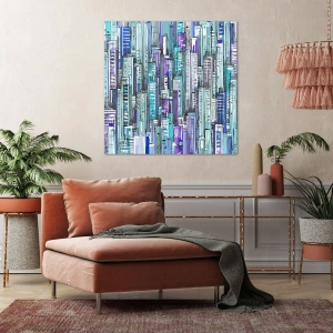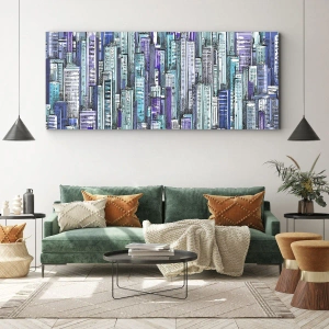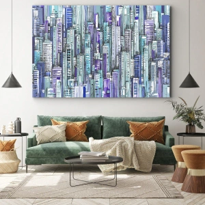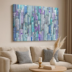 Impression sur toile - Image sur toile - Illustration d'une ville avec des bâtiments géométriques dans des tons de bleu et de violet. - 80x120cm - Bleuâtre avec le ciel - Décoration murale moderne pour le salon et la chambre ARTTOR