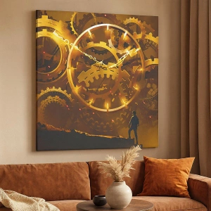 Impression sur toile - Image sur toile - Engrenages dorés dans un décor surréaliste avec une figurine - 80x120cm - À la source du temps - Décoration murale moderne pour le salon et la chambre ARTTOR