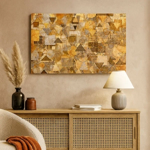 • Cette toile imprimée présente des motifs géométriques abstraits aux tons dorés et bruns. C'est l'accessoire décoratif idéal pour apporter élégance et harmonie à tout intérieur.