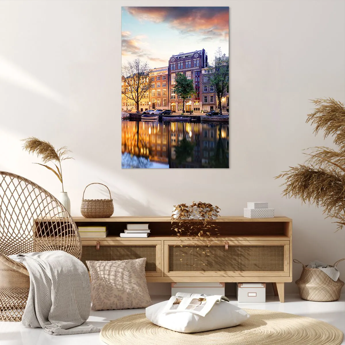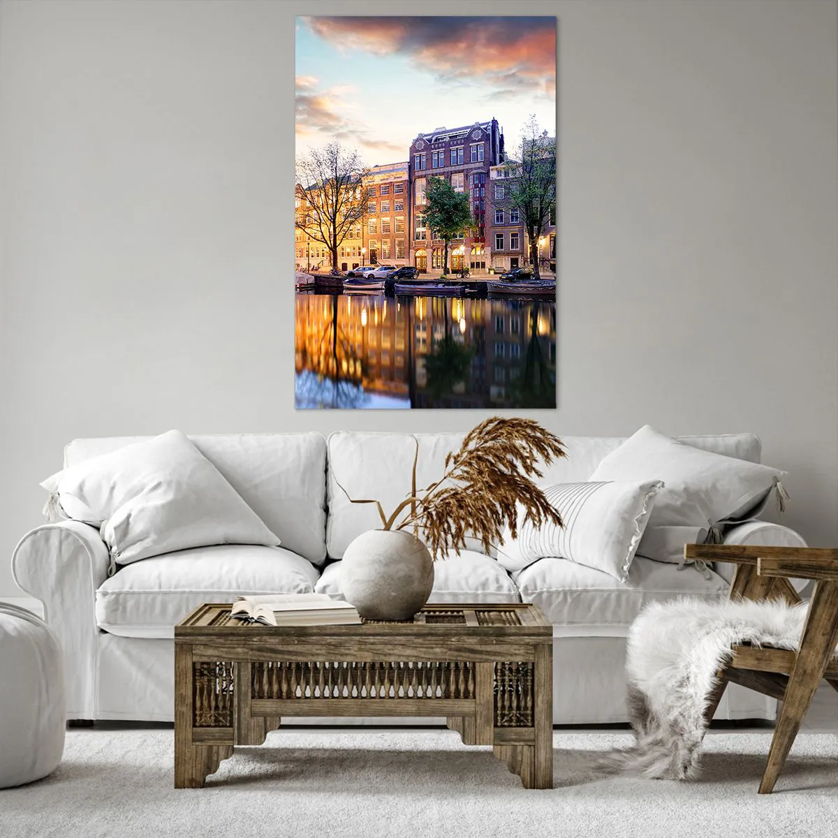 Impression sur toile - Image sur toile - Canal avec reflet des immeubles d'habitation dans la lumière du soir - 80x120cm - Beauté hollandaise sobre et sereine - Décoration murale moderne pour le salon et la chambre ARTTOR