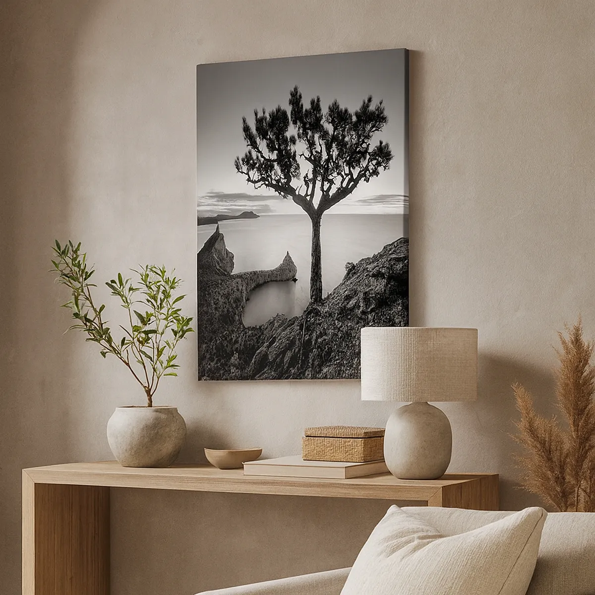 Impression sur toile - Image sur toile - Paysage noir et blanc avec un arbre solitaire sur une falaise au-dessus de la mer - 50x70cm - Paix jusqu'à l'horizon - Décoration murale moderne pour le salon et la chambre ARTTOR