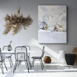Impression sur toile - Image sur toile - Paysage d'hiver avec un chalet et des meules de foin dans les montagnes - 80x120cm - Dans une vallée enneigée - Décoration murale moderne pour le salon et la chambre ARTTOR