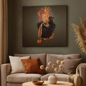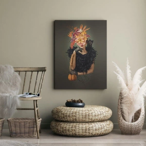 Impression sur toile - Image sur toile - Portrait d'une femme aux motifs d'automne et un chat - 80x120cm - Sort de sorcière - Décoration murale moderne pour le salon et la chambre ARTTOR