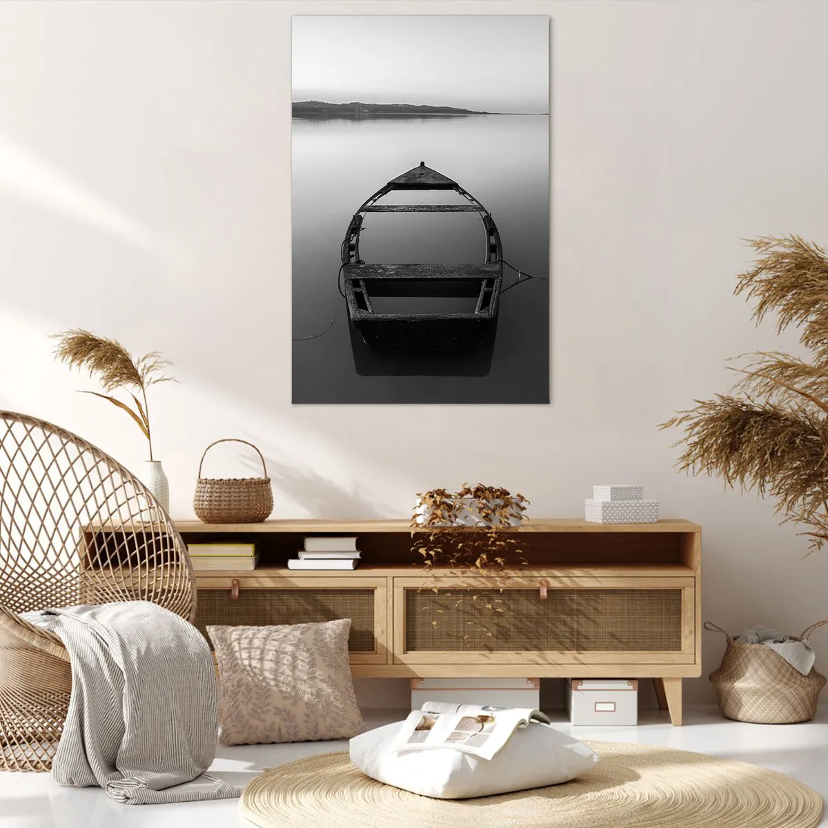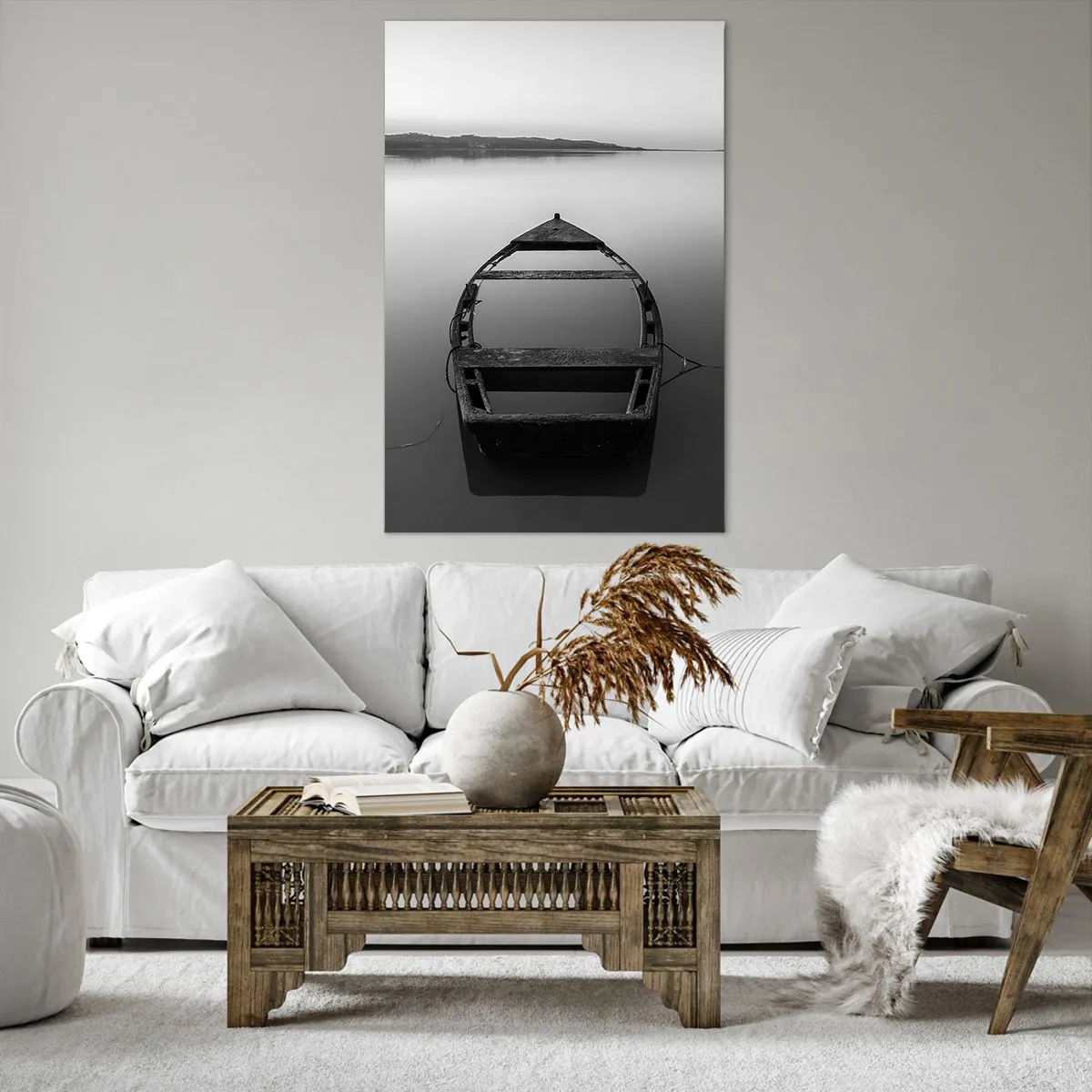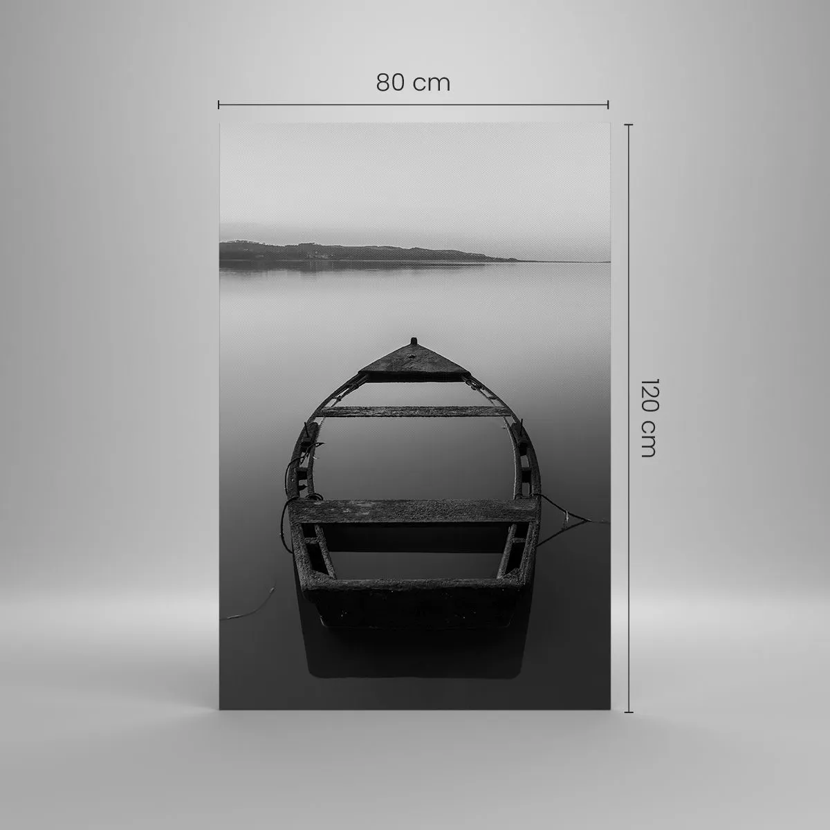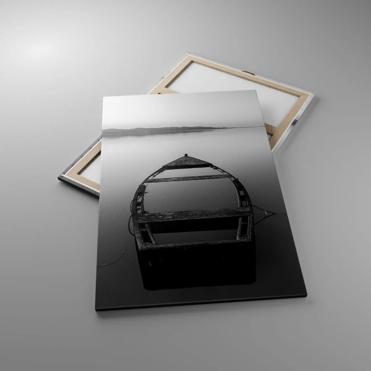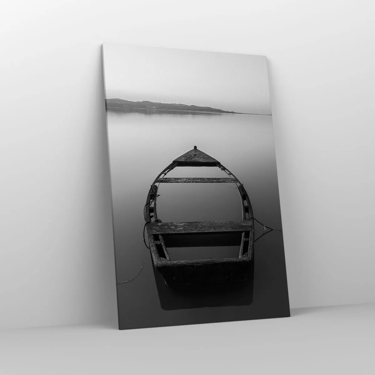 Impression sur toile - Image sur toile - Un bateau solitaire sur un lac calme dans des tons de noir et blanc - 80x120cm - Nostalgie et mélancolie - Décoration murale moderne pour le salon et la chambre ARTTOR