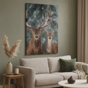 Impression sur toile - Image sur toile - Cerf dans une forêt d'hiver enneigée - 50x70cm - Le roi de la forêt avec sa femme - Décoration murale moderne pour le salon et la chambre ARTTOR