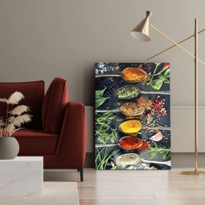 Impression sur toile - Image sur toile - Épices colorées sur des cuillères avec des herbes en arrière-plan - 50x70cm - Magie culinaire - Décoration murale moderne pour le salon et la chambre ARTTOR