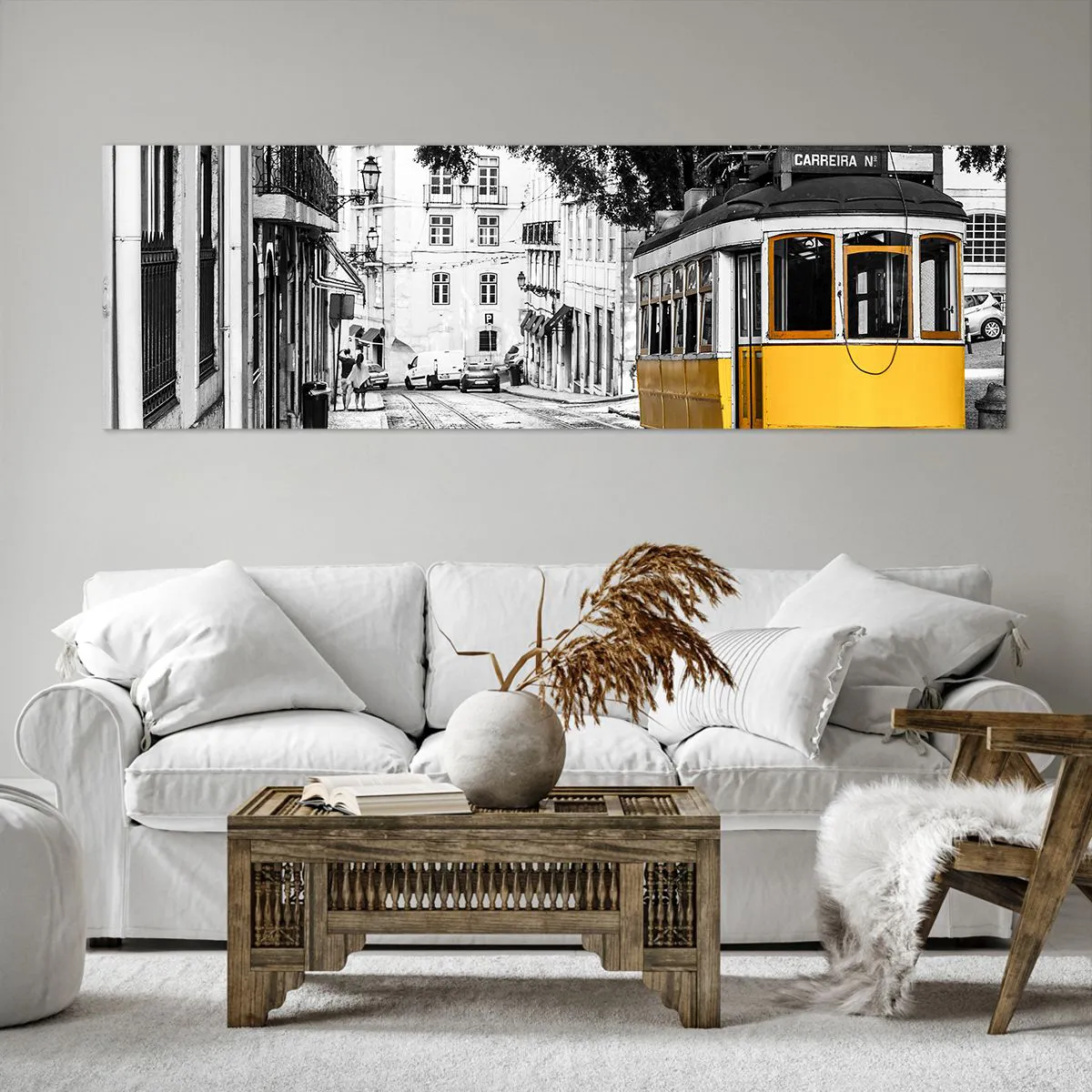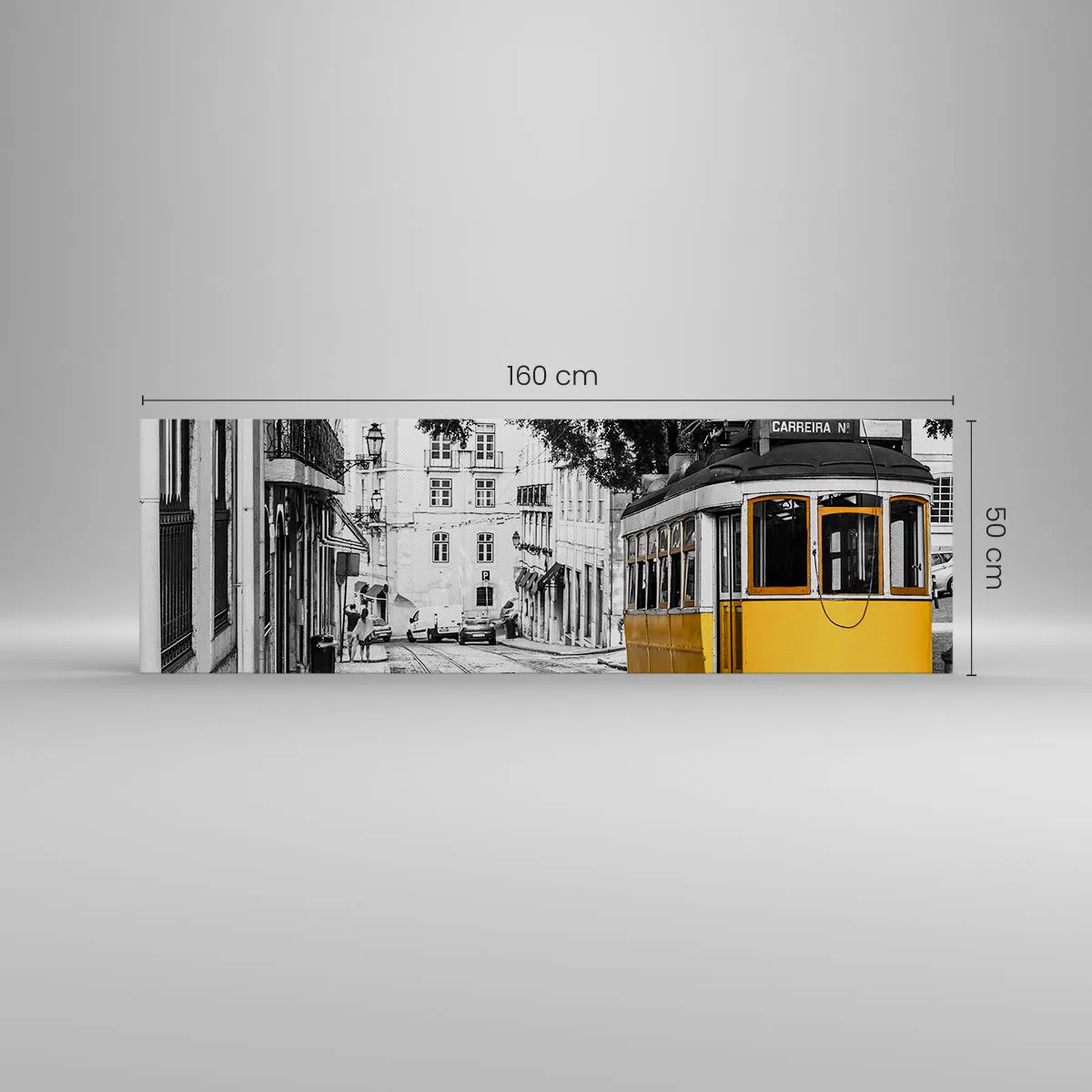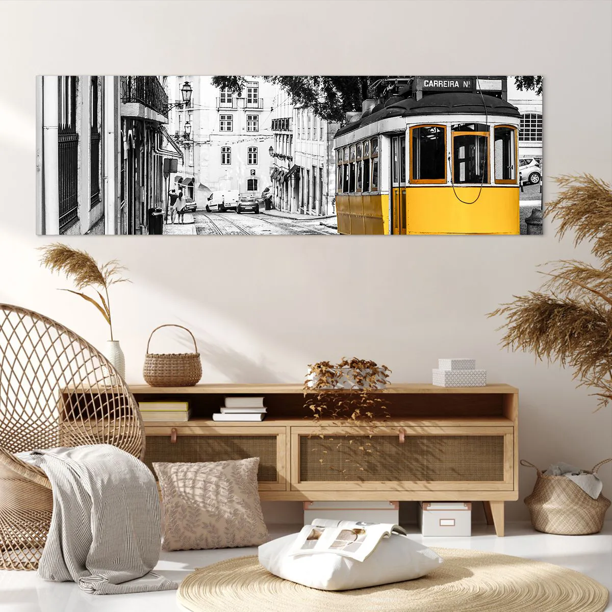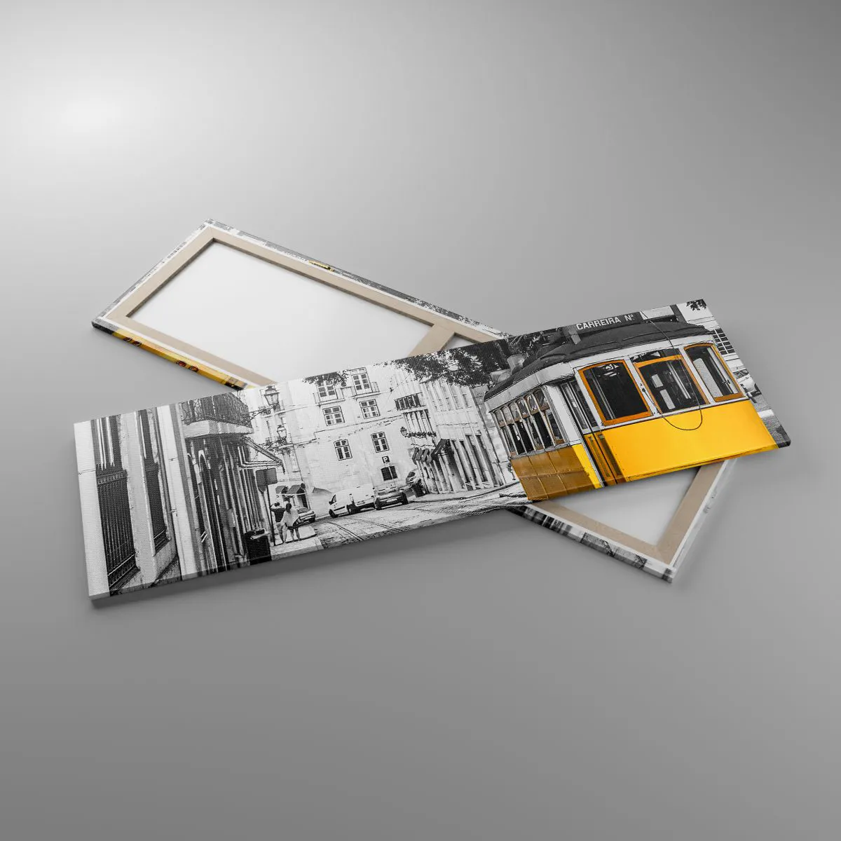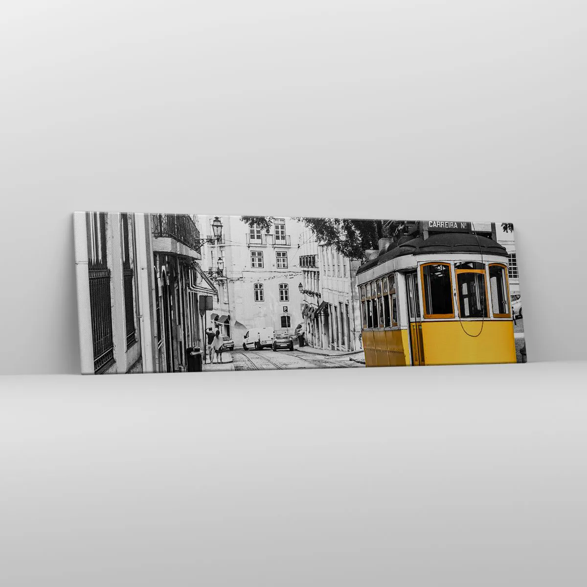 Impression sur toile - Image sur toile - Un tramway jaune sur fond de rue en noir et blanc - 160x50cm - Et du fado en arrière-plan - Décoration murale moderne pour le salon et la chambre ARTTOR