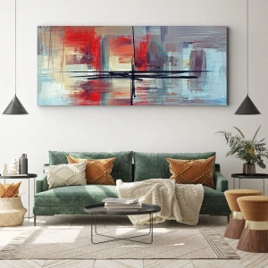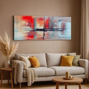 Le tableau « Paysage dans une dimension inconnue » est une œuvre d'art abstrait unique qui attire le regard par ses couleurs intenses et ses lignes dynamiques. Les dominantes de rouge, de bleu et de beige se marient harmonieusement, créant une impression de mouvement et de profondeur. Les formes géométriques et les lignes contrastées ajoutent un caractère moderne à la composition.