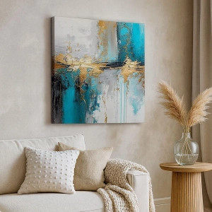 - Cette toile imprimée de 70 x 50 cm représente une composition abstraite aux tons turquoise et doré. Elle s'intégrera parfaitement dans un intérieur moderne et élégant.