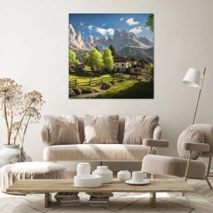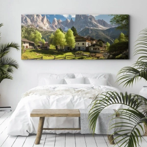 Impression sur toile - Image sur toile - Un village de montagne avec des maisons et une vue sur les Alpes - 120x50cm - Idylle alpine - Décoration murale moderne pour le salon et la chambre ARTTOR
