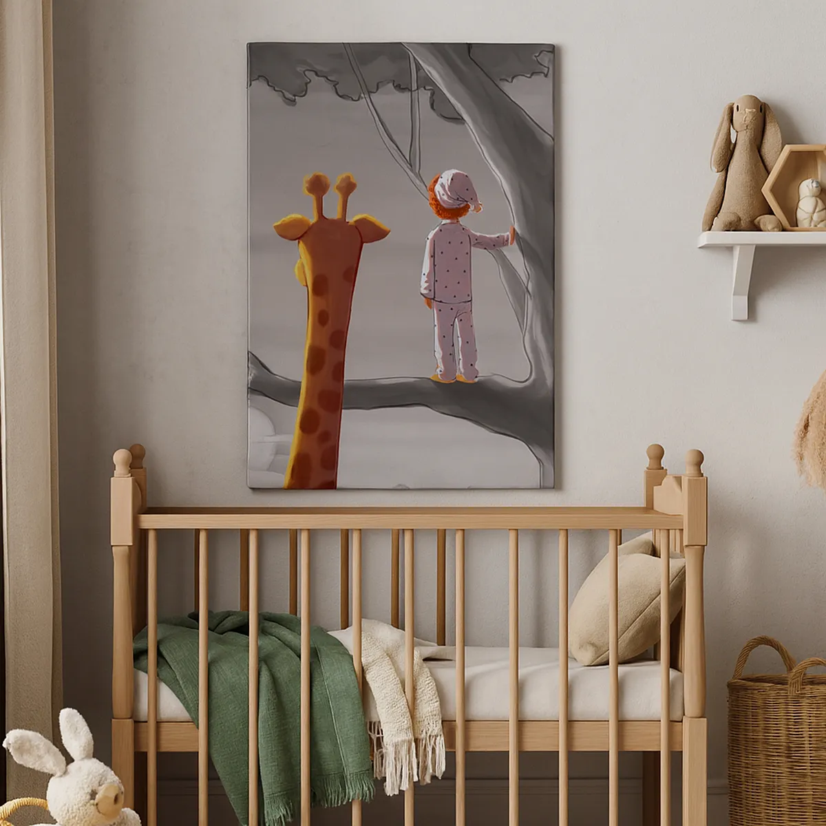 • Une scène féerique avec un enfant et une girafe dans un arbre, au cœur d'un paysage subtil. Une décoration parfaite pour apporter confort et fantaisie à n'importe quel intérieur.