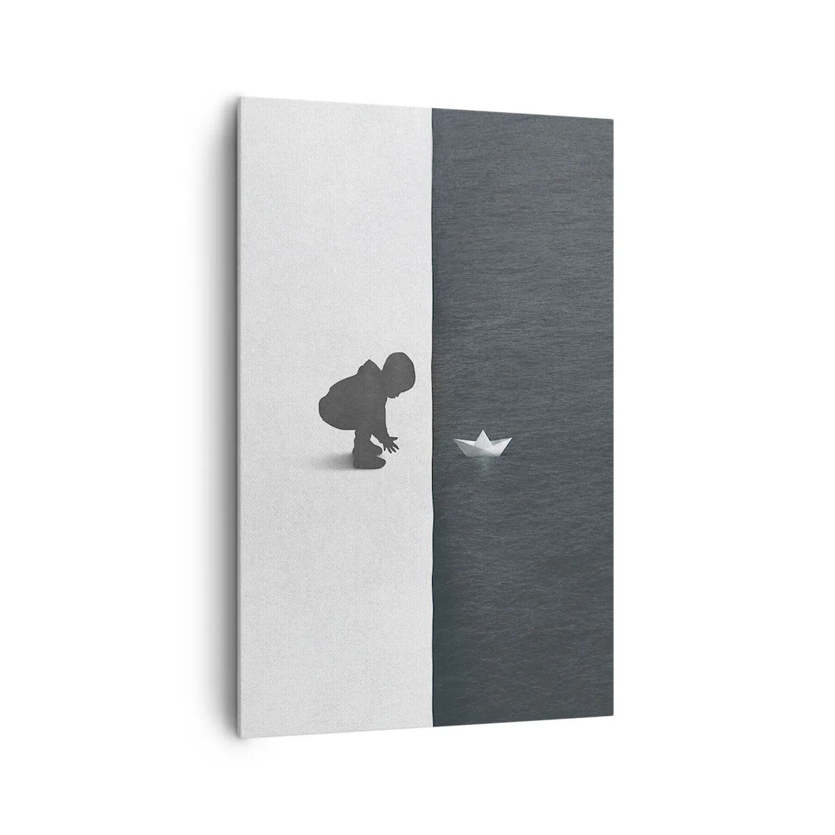Impression sur toile - Image sur toile - Une figure d'enfant avec un bateau en papier sur un fond de moitiés contrastées - 80x120cm - Grande expédition - Décoration murale moderne pour le salon et la chambre ARTTOR